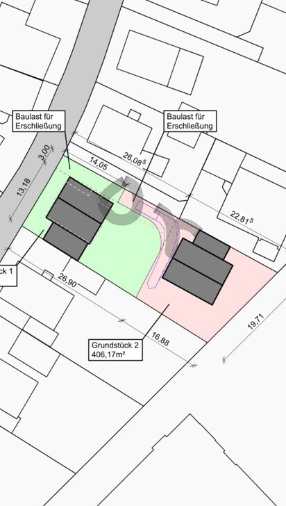 anbei nochmal die Lage weiter herausgezoomt...Wirklich einen entscheidenden Siebenmeilenschritt verständlicher ist es noch nicht geworden. Befürchte ich recht, daß 1. der Übergang grün/rosa die vorgesehene Abmarkungslinie zwischen dem Vorderliegergrundstück und Eurem Bauplatz darstellen soll und 2. Ihr gleich zwei Erschließungs-Baulasten braucht, nämlich von "vorne" durch den Garten von Grün ein Leitungsrecht, und zusätzlich zu Eurem Zufahrtszipfel auch von der "Seite" noch ein das Geh- und Fahrrecht über die Einfahrt von Weiß ?(und natürlich 3. daß Ihr meinen vorherigen Beitrag nicht wirklich gelesen habt). So ist das recht frustrierend und ich gehe dann wohl mal besser ein Zimmer weiter zum nächsten, kooperativeren Patienten.