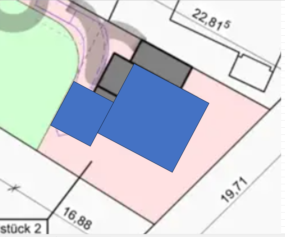 Aber es ist so, dass ein Haus in der eingezeichneten Garage parken wird und eins vorm Haus. Zudem wollen wir Richtung Südwesten unsere kleine Terrasse haben und auf der Ostseite möglichst nur Garten zum Spielen usw.