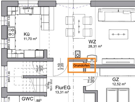 wiltshire20.05.25 09:36Mir fällt noch was zur Heiztechnik ein - ein zentraler Grundofen. Der wärmt Küche, Essbereich, Wohnbereich, Flur und Gästezimmer sowie den Treppenbereich und den oberen Flur. Der orangefarben dargestellte Bereich wird Speichermasse, eine Glastüre kann zum Essbereich hin eingebaut werden, mögljch sind auch zwei, das kostet aber Effizienz. Natürlich muss so ein Ofen nicht Eckig sein, im Flur und Gästezimmer bieten sich Abrundungen oder Winkel an.