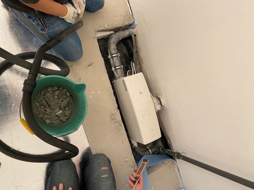 Die Anlage ein eine "FLOW CUT BOX CONEL", die der SanitĂ€rbetrieb selbststĂ€ndig ausgesucht hat (war laut Bauleistungsbeschreibung keine genaue definiert). Die Anlage wurde vom Planer in den Raum "hinter "dem Bad geplant, also sozusagen durch die Wand hinter dem Klo durch, da ist Kellerraum, und da stört sie nicht (was auch so ist). Sie bedient Dusche, WC und waschbecken. UrsprĂŒnglich war die Anlage auf dem Estrich geplant. Da aber dann die Dusche ein hohes Podest benötigt hĂ€tte, hat der bautrĂ€ger entschieden, diese auf den RohfuĂboden zu stellen und den Estrich darum auszusparen. Klag damals als super Idee, wĂŒrde man immer so machen.