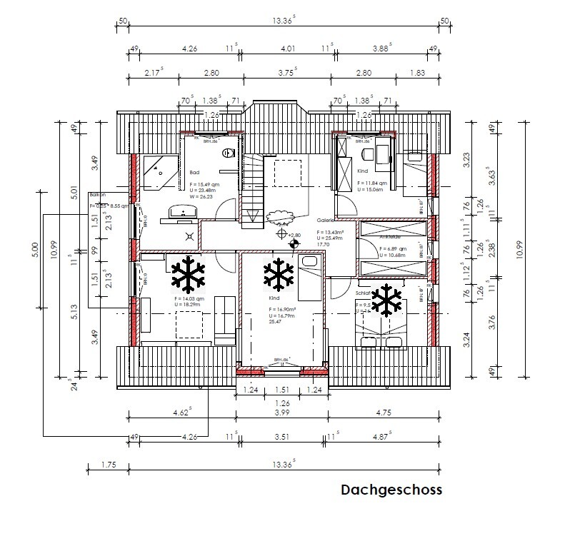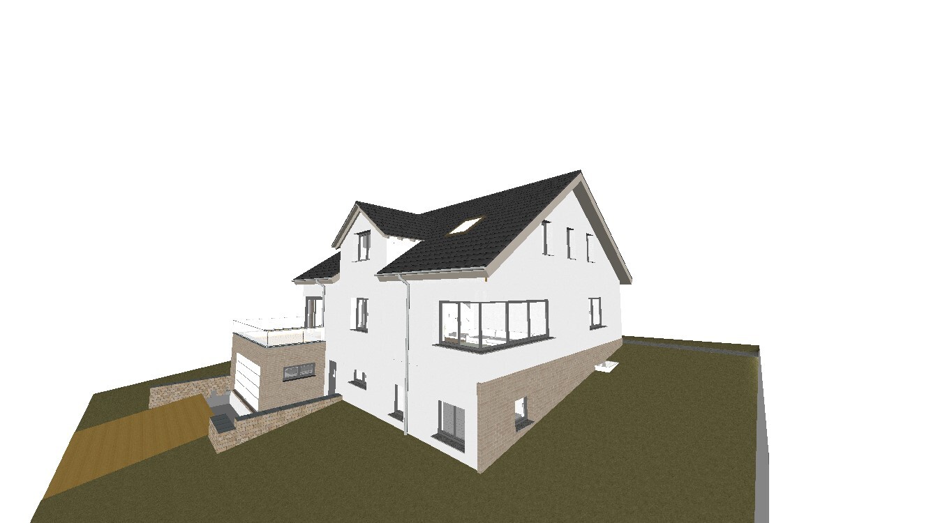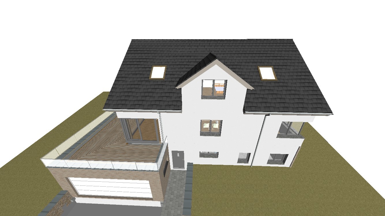 Im Dachgeschoss haben zwei von den drei Räumen (nämlich Büro und Schlafzimmer) Dachfenster, die voraussichtlich mit außenliegenden Rolles versehen werden. Das mittlere Zimmer (Kind) befindet sich im Frontspieß und bekommt ein ganz normales Rollo.