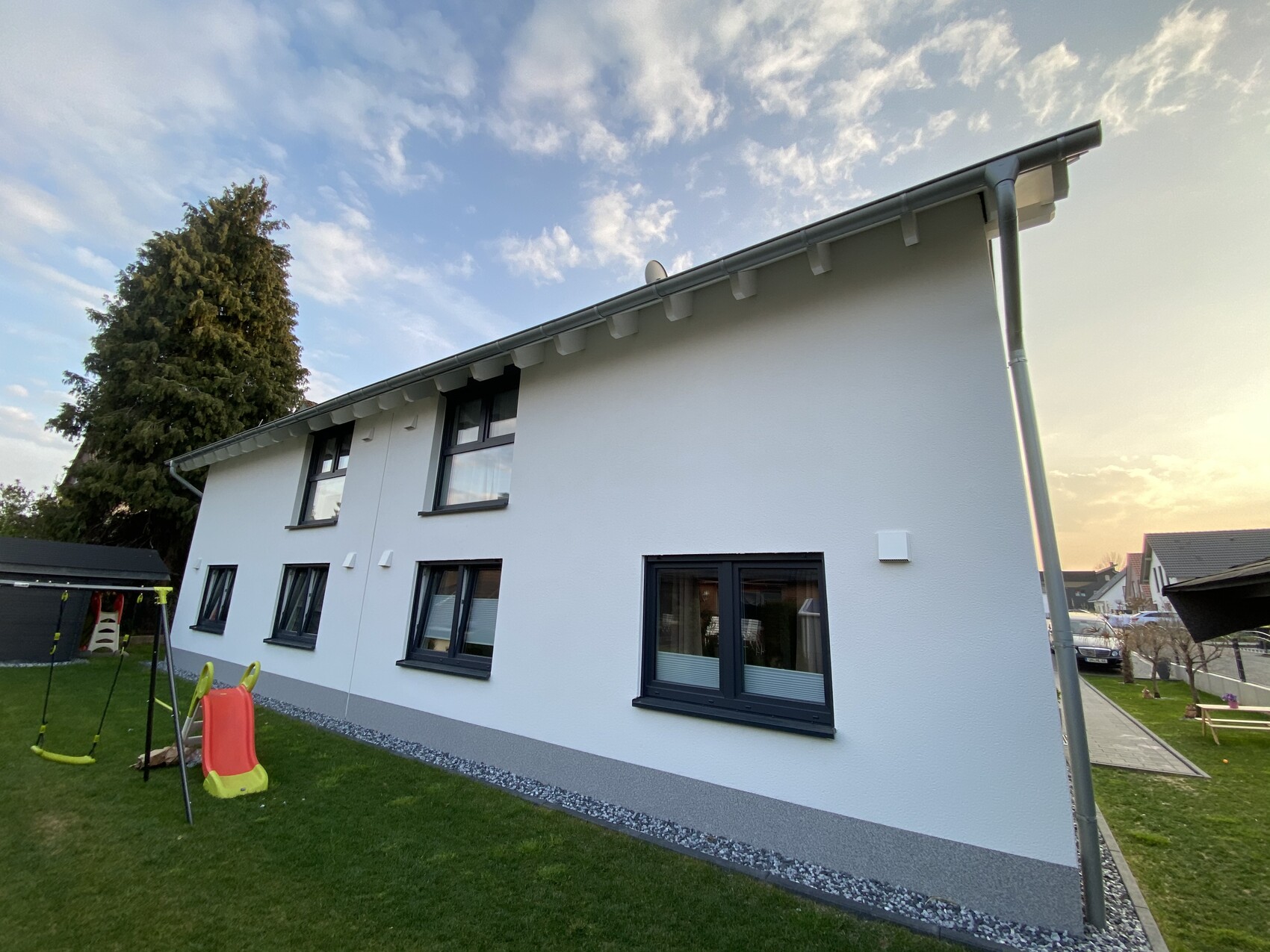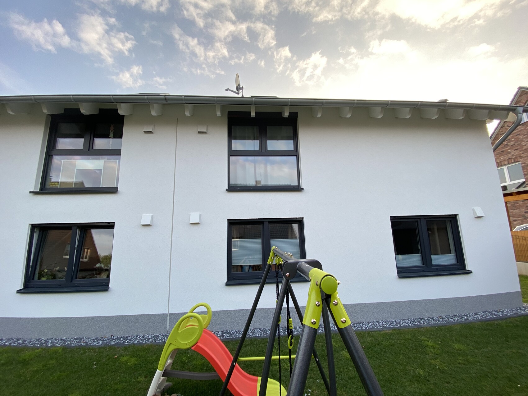 Unsere Rohbaumaße der "normalen" Doppelflügelfenster sind aktuell mit 162,5x143 bemaßt. Das muss ich aber noch einmal hinterfragen, was da dann an lichtem Maß übrig bleibt für die Fenster. Alles extrem verworren, da sich die Brüstungshöhe auf die OK Rohfußboden bezieht, dass Fenster bei 18cm Fußbodenaufbau dann aber ziemlich tief wäre. Und das Rohbaumaß von 143cm in der Höhe würde keinen Aufsatzrollladen berücksichtigen, warum auch immer nicht.Leider kann ich die beiden Doppelhaushälfte frontal fotografieren, da ich sonst aufs Nachbargrundstück muss. Ich habe aber trotzdem paar Fotos gemacht.