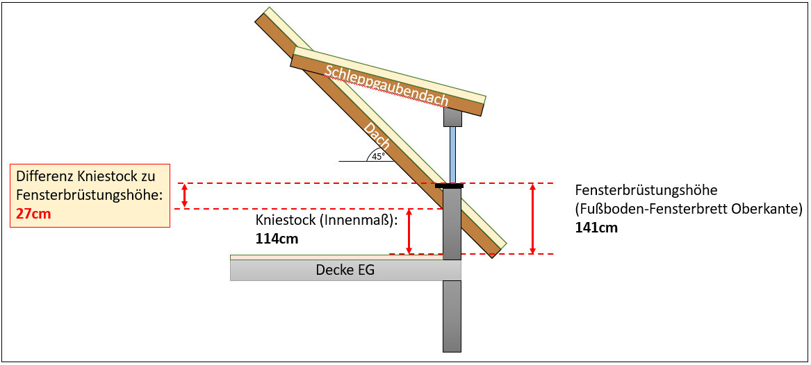 Das Fensterbrett in der Gaube liegt ca. 27cm höher als der Kniestock, jeweils von innen ab Fußboden gemessen.
