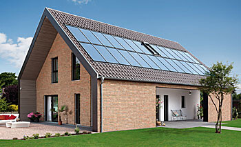 Und hier noch mal das S.-Haus mit dem Eingangsbereich: Das Haus ist symmetrisch vom First aus auf der Giebelseite, also klassisch, die Außenwand selbst ist zurückgezogen, sodass ein höherer versteckter Kniestock entsteht.