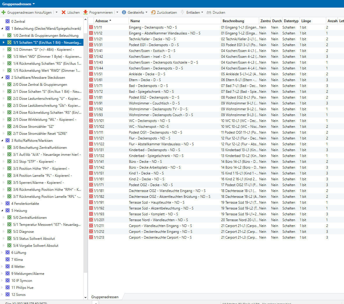 Der PM im Eingang hat folglich die Phys.Adresse 11 am Ende, Der Taster im Eingang 12. Der PM im Carport hat die 211. Aktorik im Schaltschrank fängt dann bei 22 an. Dort dann noch aufgeteilt in Aktorik-Gruppen.