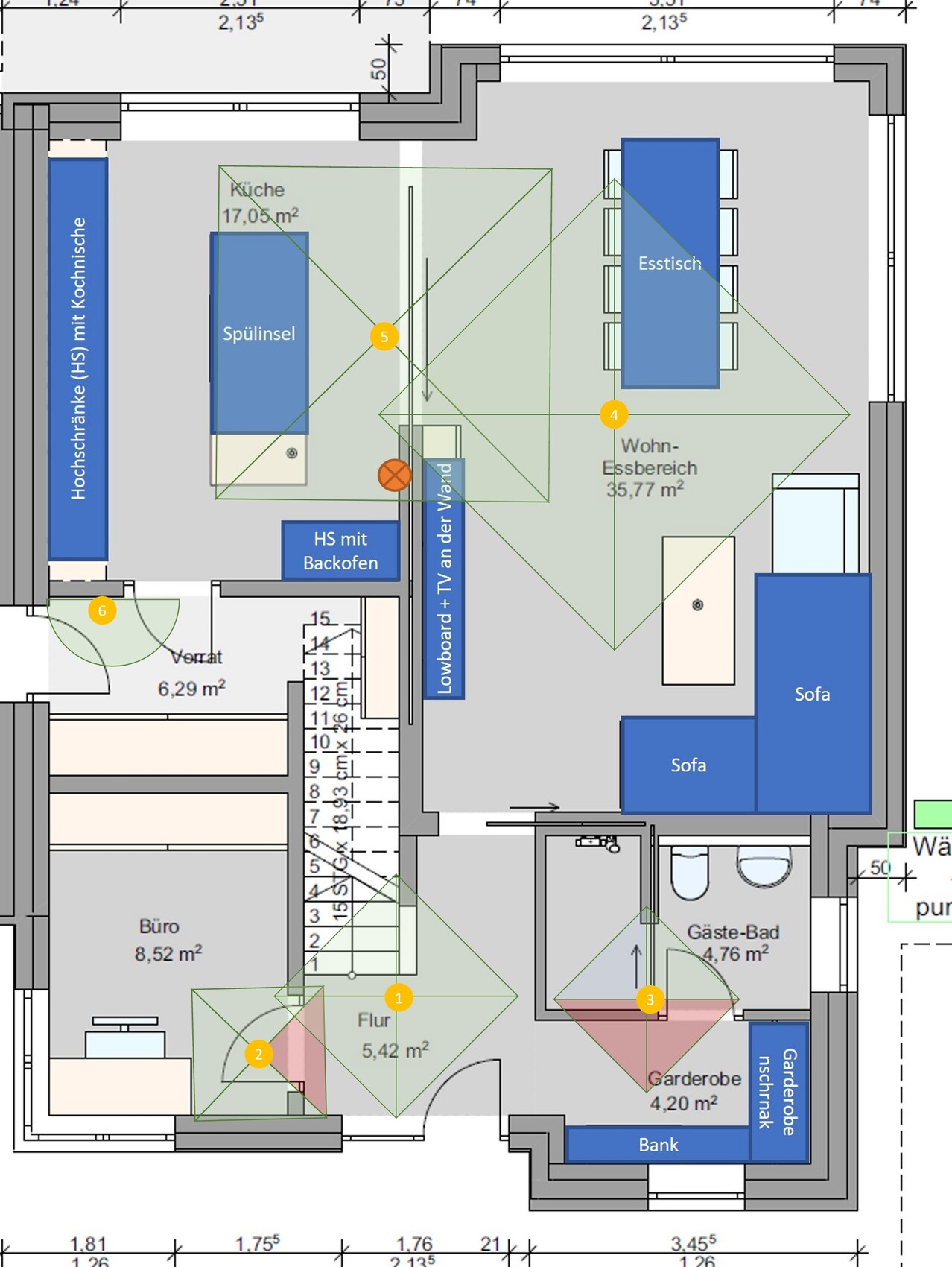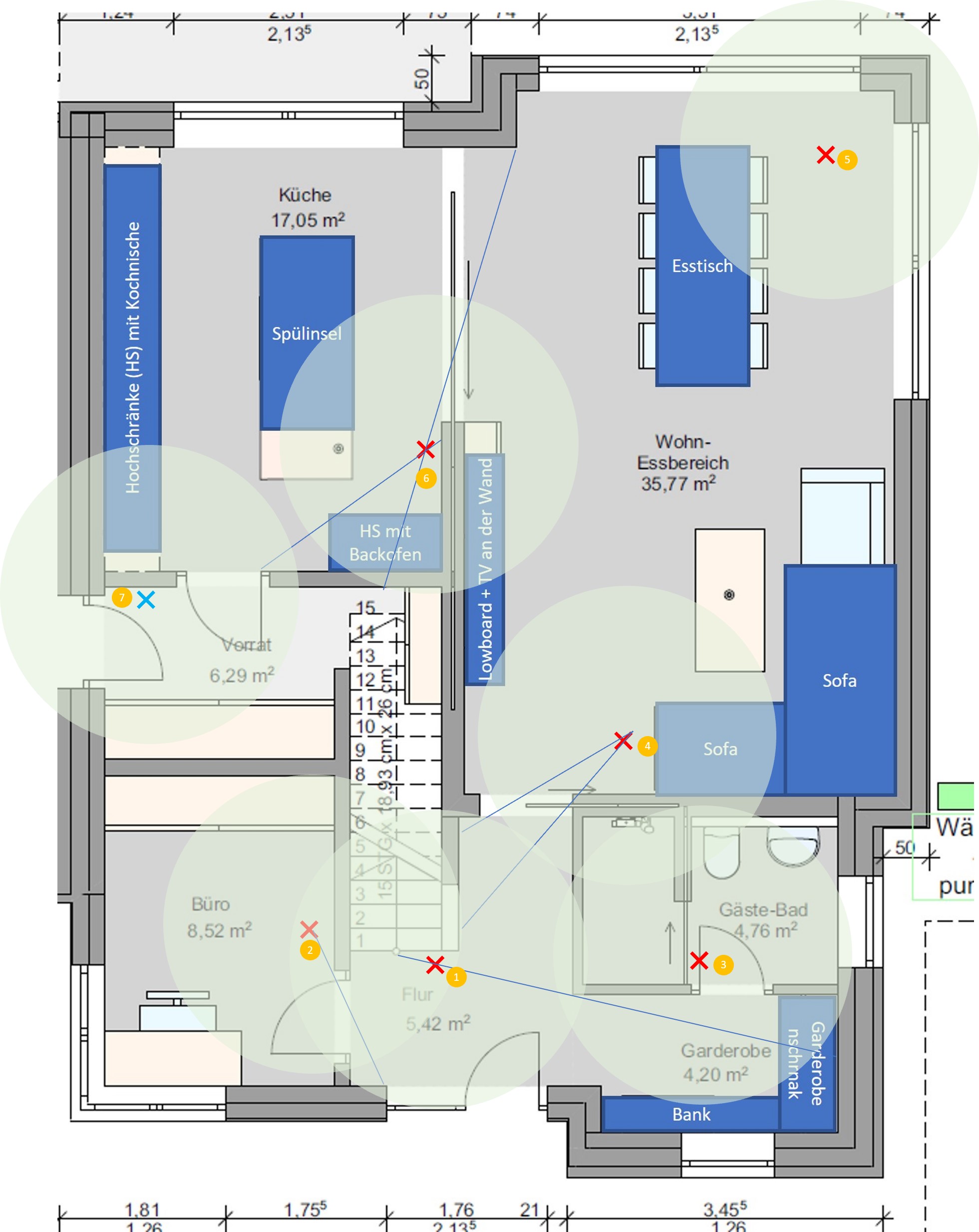 Die hellgrünen Kreise habe ich erstellt, um eine grobe Orientierung der Erfassung darzustellen. Das es nicht durch Wände geht, ist mir klar, nur leider habe ich kein geeignetes Programm um es anders zu visualisieren.