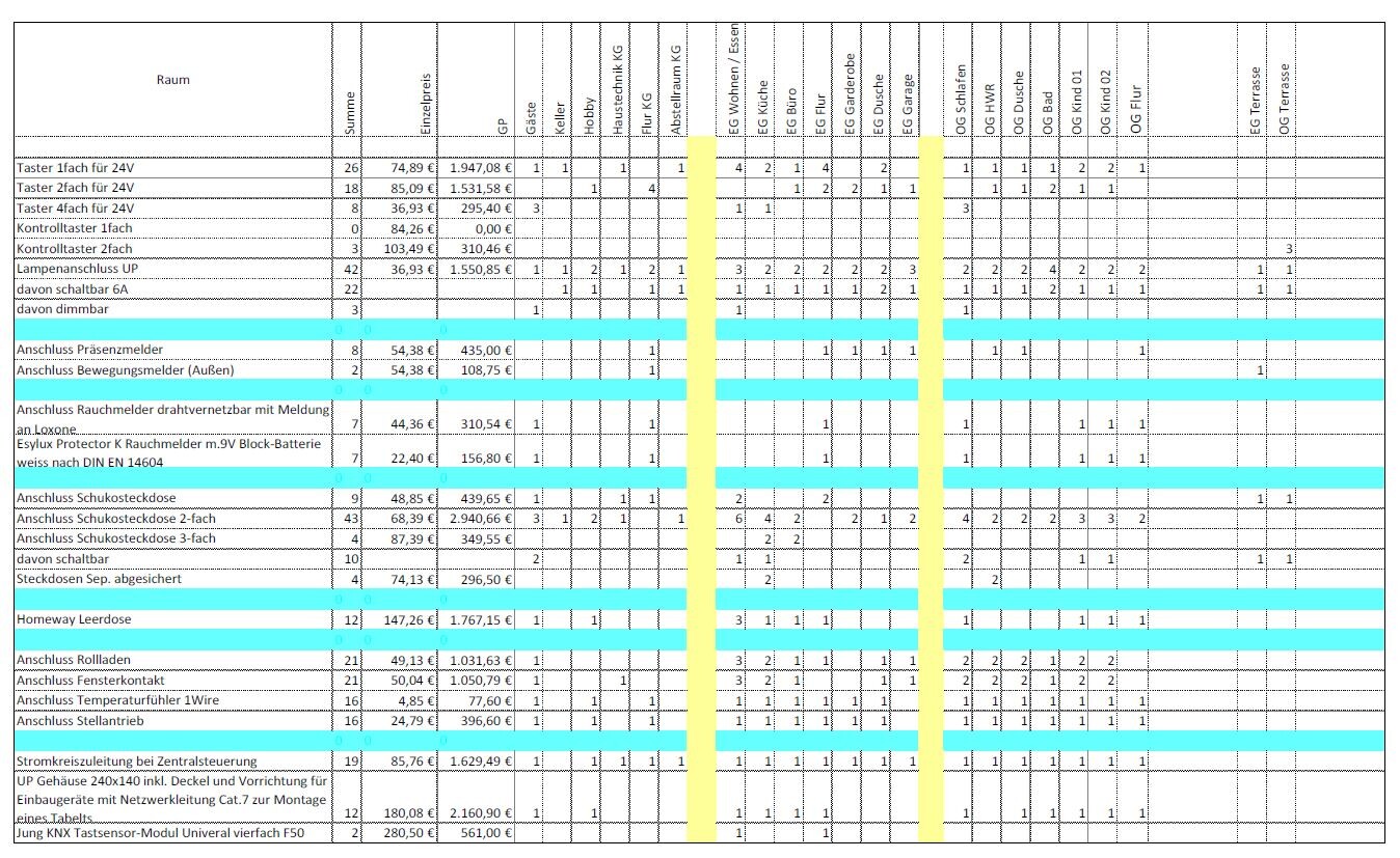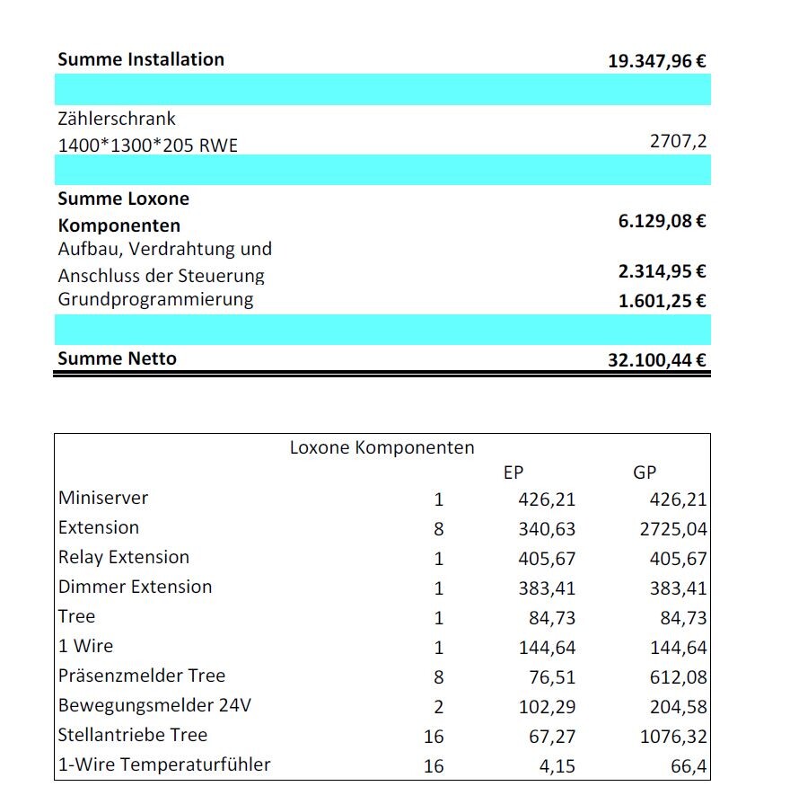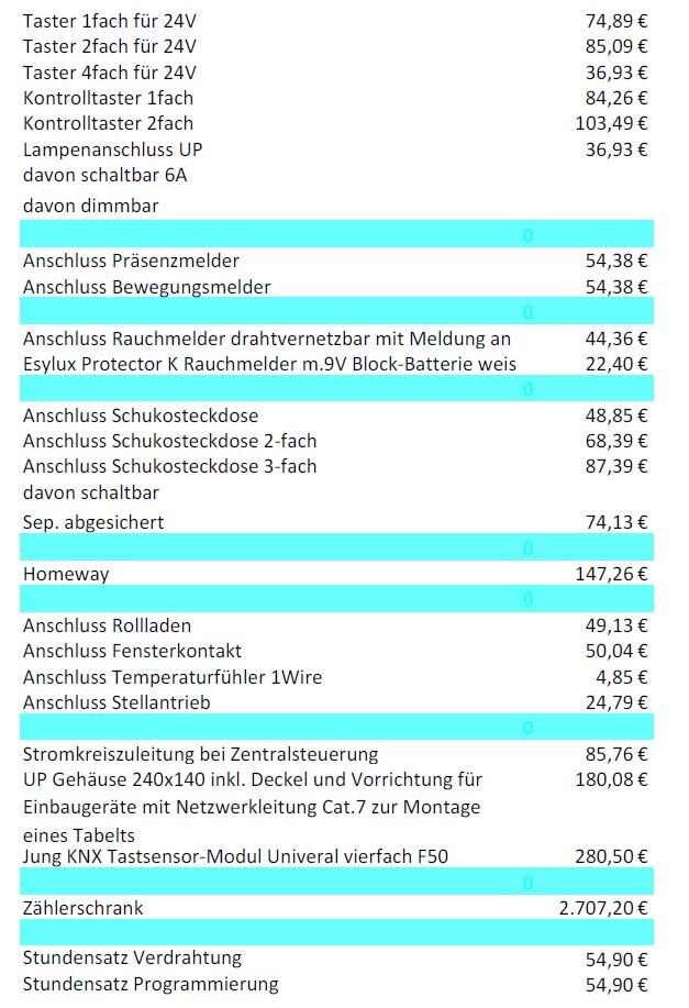 Ja ok. Da muss man fairer Weise sagen, dass eine 08/15 Elektrik keine Basalte Taster, keine Videoüberwachung und auch nicht zig Visualisierungen verbaut hat. Das kürze ich ja alles weg. Trotzdem wird es teurer sein. Und der Nutzen steht in Frage.