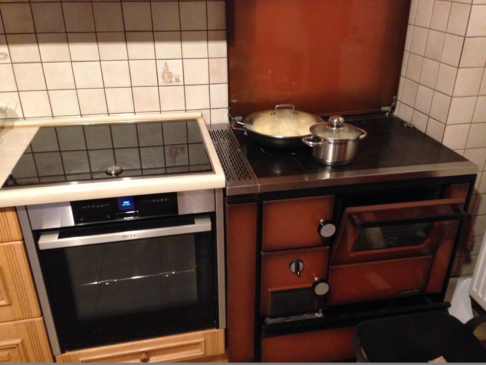 Zwischen Elektroherd und Holzofen sieht man den Abstandshalter. Der Abstandshalter hat innen noch Abschirmbleche. Auf dem anderen Bild sieht man seitlich am Hängeschrank eine furnierte Blende. Diese machte bei uns am meisten Probleme. Die Fronten dafür keine, da diese Birke massiv sind.