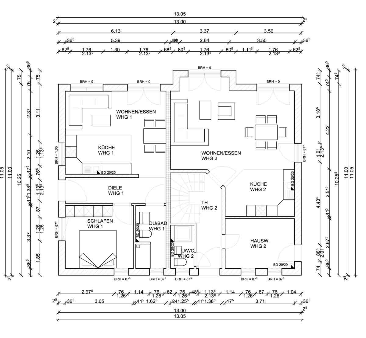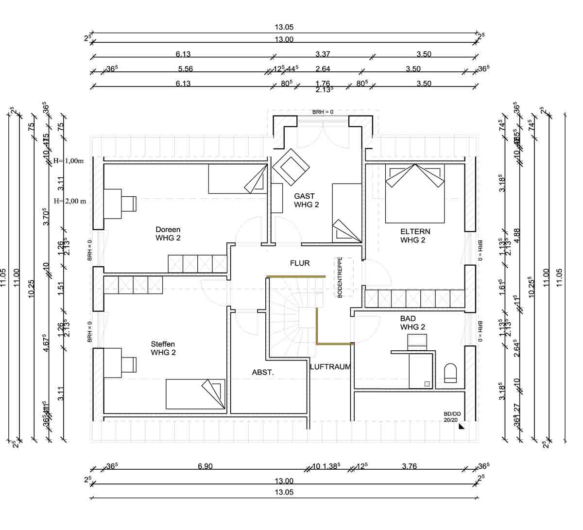 Damit Du ein Gefühl für das Preis-/Leistungsverhältnis bekommst, habe ich meiner Antwort sowohl den Erd- als auch den Dachgeschoßgrundriss eines Einfamilienhaus mit Einliegerwohnung angehängt. Die Einliegerwohnung hat 48,47 qm Wohnfläche, die Hauptwohnung 136,36 qm Wohnfläche; wir reden hier also insgesamt über knappe 185 qm Wohnfläche. Als Kfw 70 Effizienzhaus auf Bodenplatte schlagen hier TEUR 280 - ohne Malerarbeiten und Bodenbeläge - zu Buche.