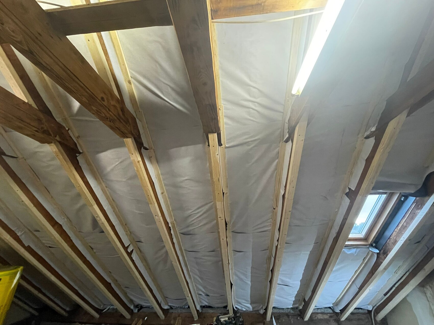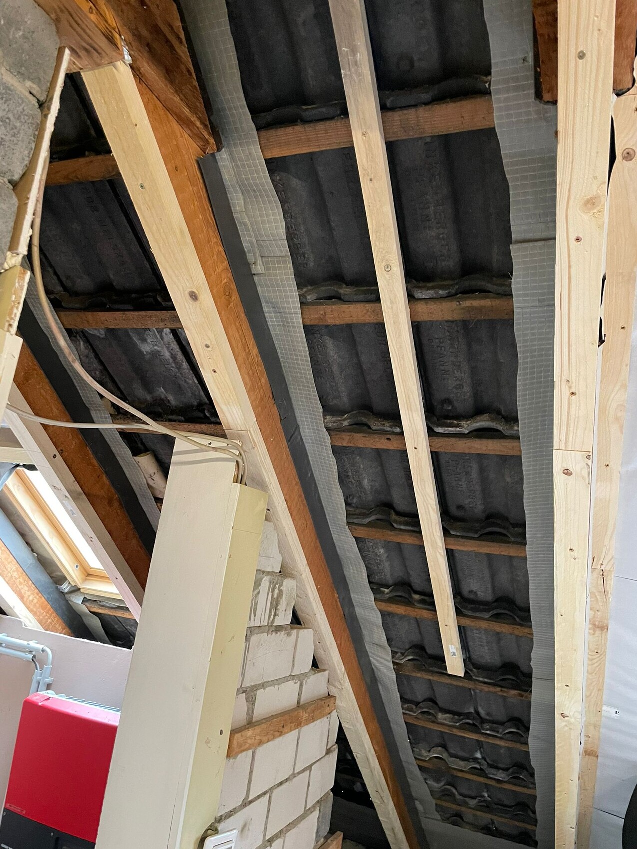Wir haben aber an den Dachfenstern jeweils einen senkrechten Schlitz in die Dampfbremse gemacht, um die Fenster öffnen und lüften zu können.