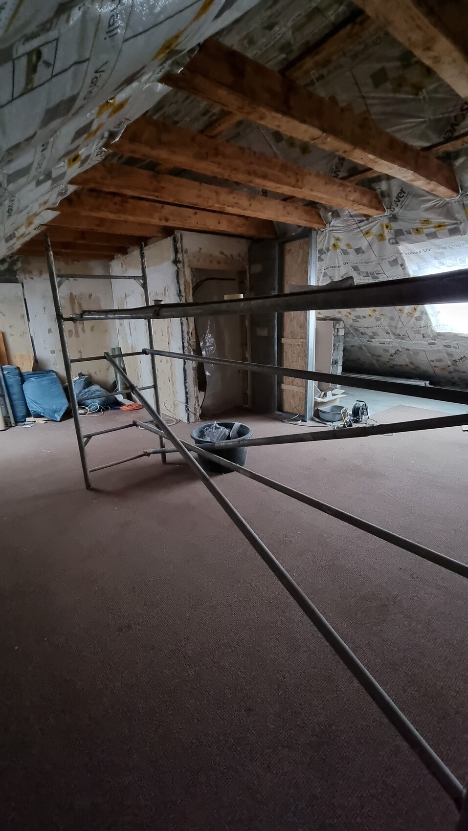 4. Im November 2024 haben wir die Dampfbremse angebracht und wirklich alles nach unseren Möglichkeiten akkurat verklebt, auch alle Rohrdurchdringungen, Wand und Bodenanschlüsse, Balken. Haben nicht nur mit den Tapes von Isover gearbeitet, sondern auch mit dem DoubleFit, um alles dicht zu bekommen. Wir haben zum Treppenhaus hin alles mit Folie abgeklebt und die Tür mit einer Staubschutztür aus Plastik versehen - also nicht 100% dicht.
