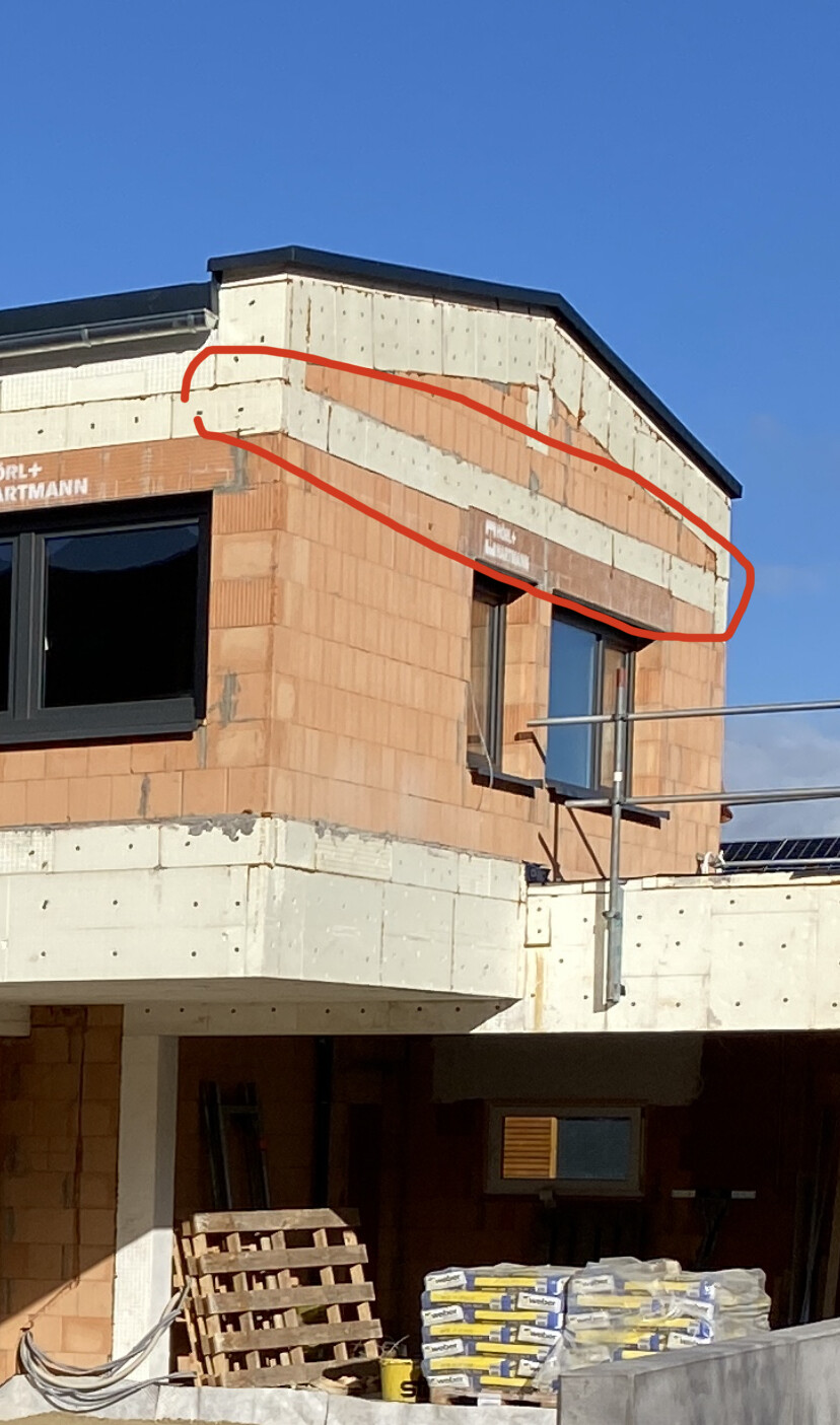 Was mir allerdings etwas Sorgen macht ist, dass die Wände im Bereich des Ringgurts extrem Nass sind (man kann innen genau den Bereich sehen). Ist das normal? Ringgurt sind von außen mit 100mm und innen mit 20mm gedämmt (siehe Bild). Der U Wert des Ringgurts ist schlechter, als der der Ziegel. Ist das evtl. das Problem oder haben wir hier ein anderes Problem?