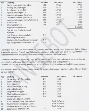 Ich rechne mit Gesamtkosten von knapp 3.000€ brutto bei 6-7 Terminen mit 1,5 Stunden vor Ort, Prüfung der Bauunterlagen, Werkvertrag, Grundstücksunterlagen.
