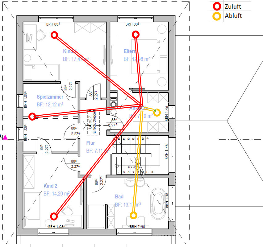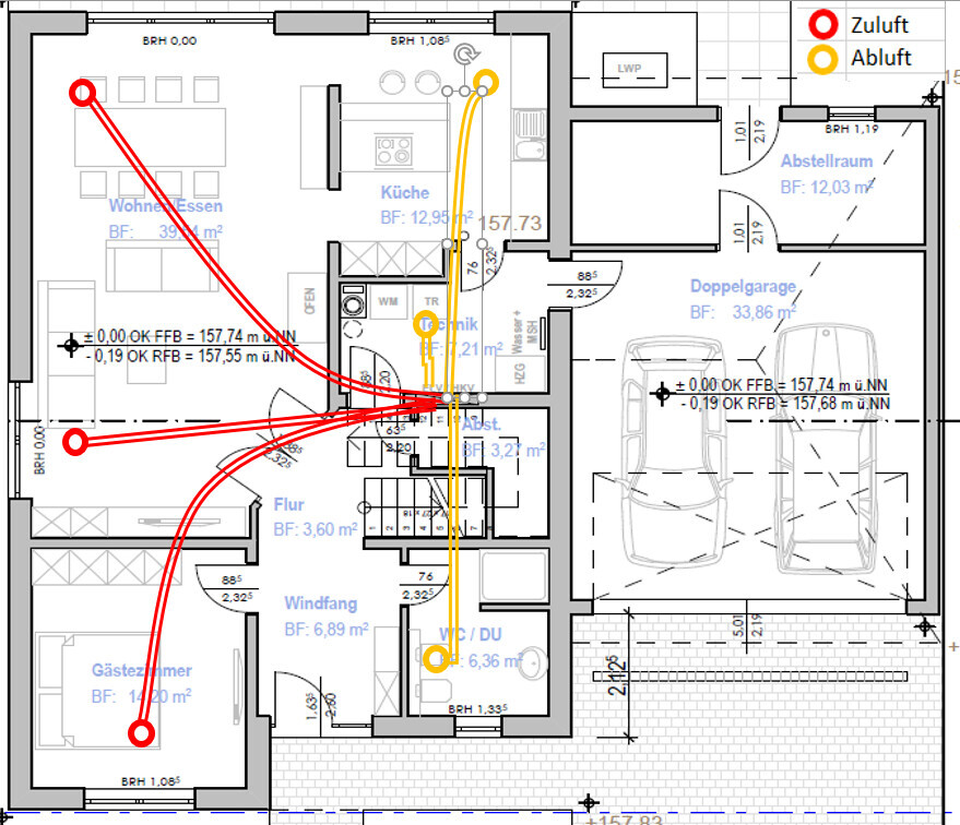 also findest du so eine Vorbereitung, ohne die Lüftungsanlage eventuell nicht sofort in Betrieb zu nehmen, als eine gute Idee?IMHO sind die Kosten einer Kontrollierte-Wohnraumlüftung sehr durch die Installation und die Rohrleitungen dominiert. Mit nur geringen Mehrkosten gegenüber der nackten Installation kannst Du die Kontrollierte-Wohnraumlüftung dann auch gleich fertig stellen. Aber bei sehr viel Eigenleistung und günstigem Einkauf kann das auch anders aussehen. Von daher ... Einzelfall.Den Deckenauslass im Esszimmer würde ich möglichst nicht über einem Sitzplatz anordnen. Im Winter kann das doch unangenehm werden. Besser etwas mehr an den Rand ...