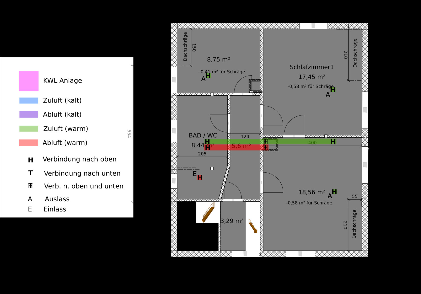 ich habe mir mal ein paar Gedanken zur Umsetzung einer Kontrollierte-Wohnraumlüftung Anlage mit Wärmerückgewinnung gemacht. Das Haus ist von 54 und wird komplett saniert. Wohnfläche später etwa 125qm. Es gibt einen Beispielrechner von Bosch der mich mit den groben Zahlen der Raeume gefuettert auf ein "Bosch Vent 5000C HR230W" kommt bei einer maximalen Leitungslaenge von 15 m.