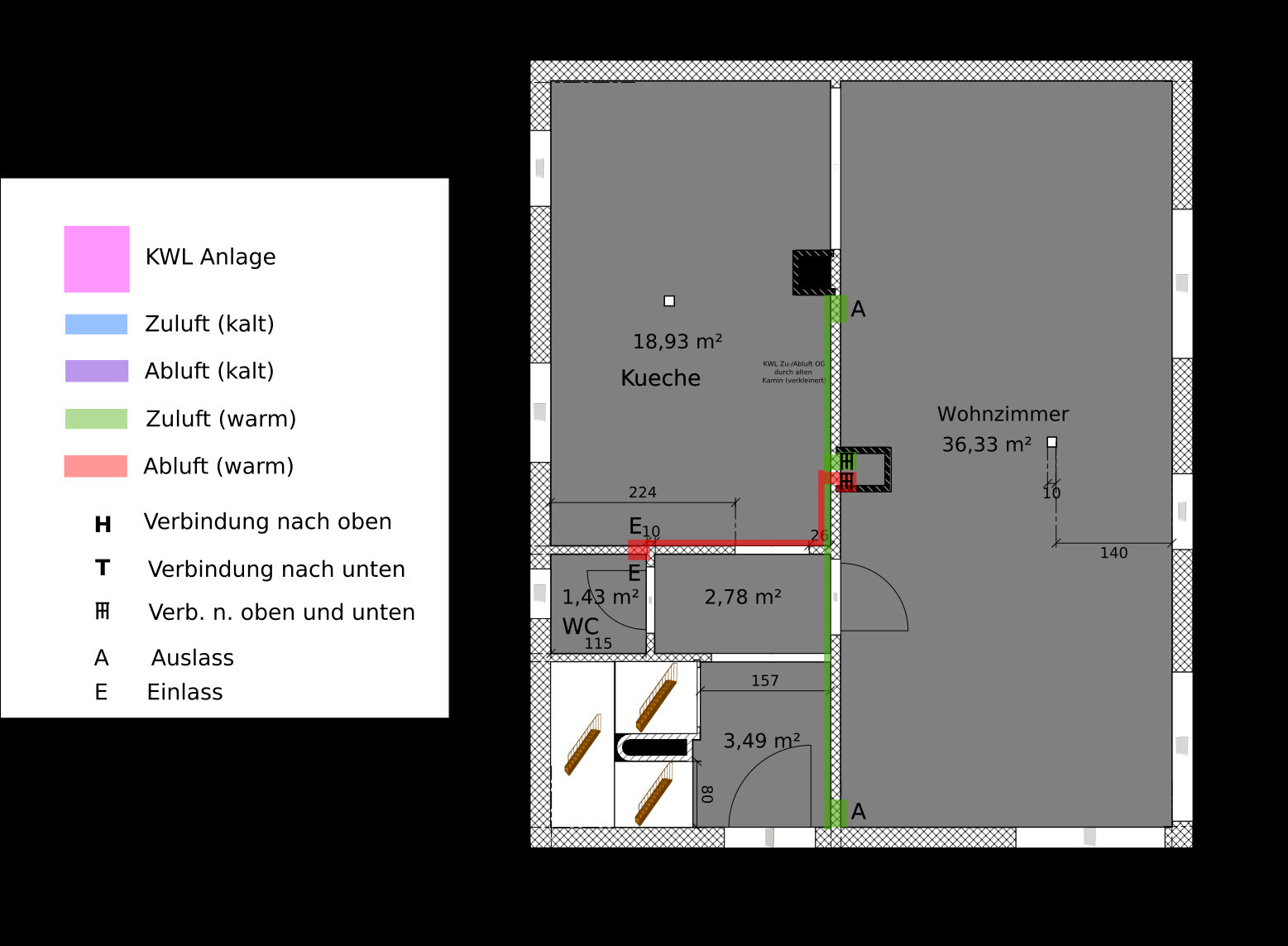 Im Keller kommt die Kontrollierte-Wohnraumlüftung Maschine mittig an den alten Ort des Kamin. Aussenlufteinlass im Süden unter der Eingangstreppe. Fortluft im Norden (nur Grundstücksgrenze und Kompost). Der enge Durchgang müsste auf dem Plan verbreitert werden.