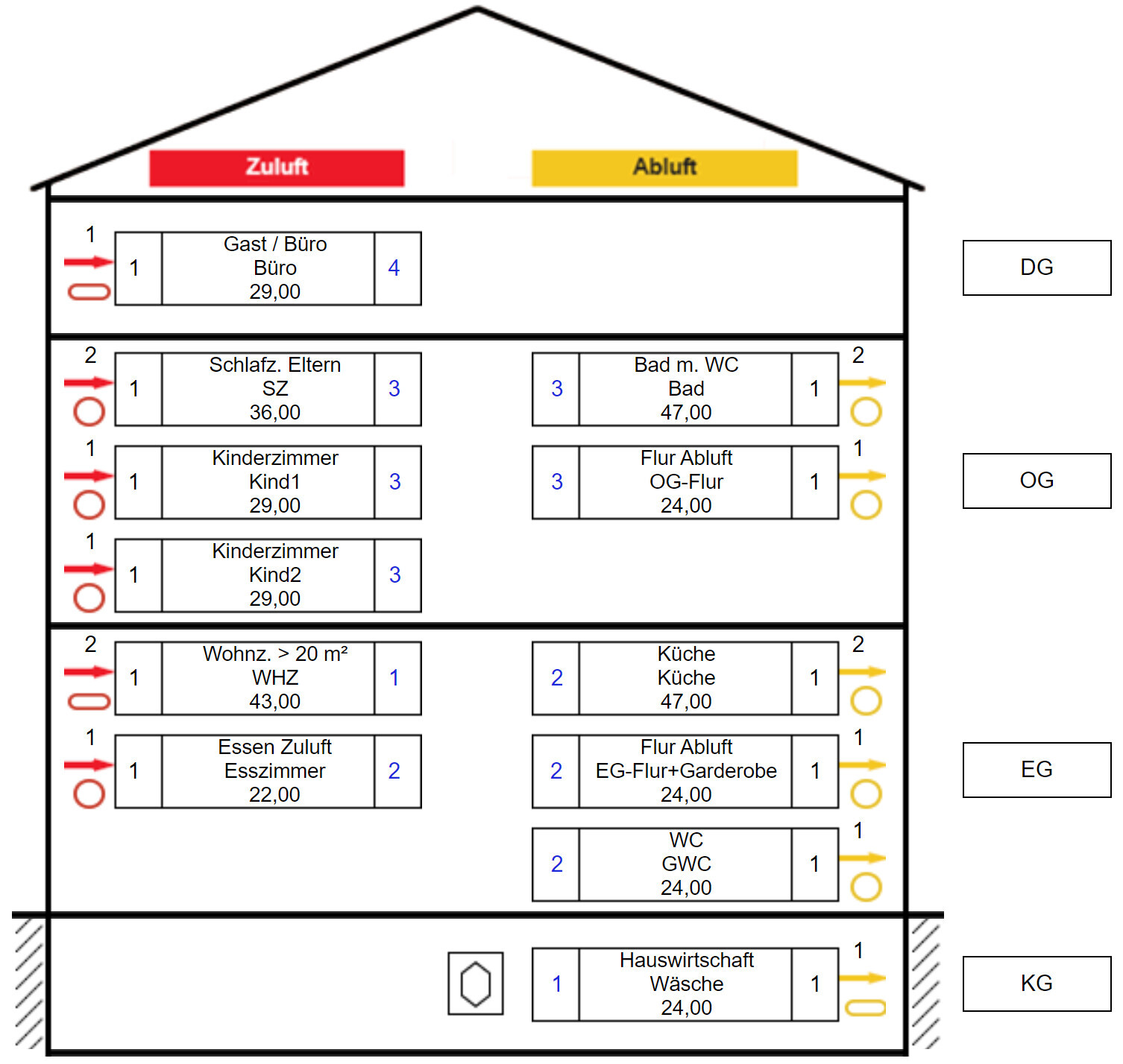 Grundriss eines Gebäudes mit Zuluft und Abluft sowie Zimmern.