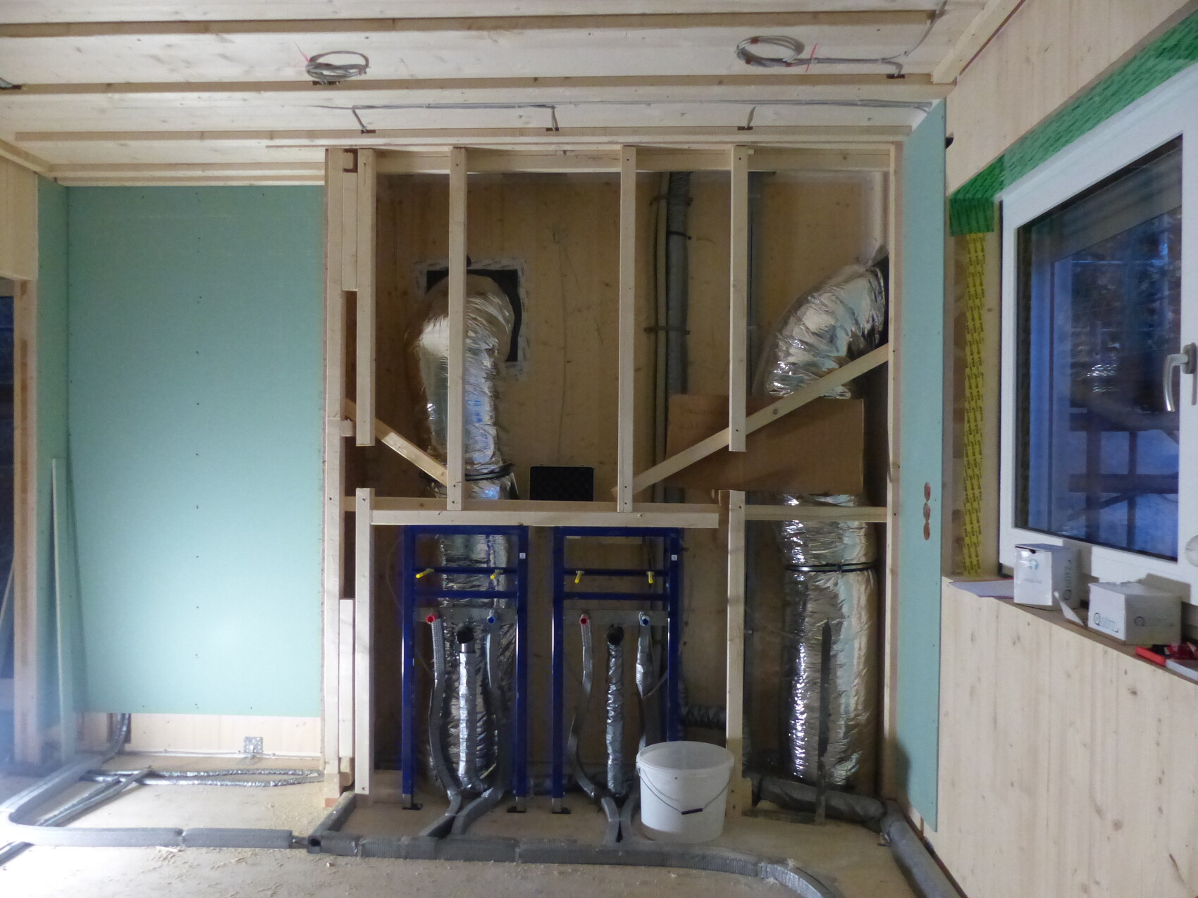 Bei uns musste die Zuluft und Fortluft im OG aus- und eingeleitet werden (Hanglage).