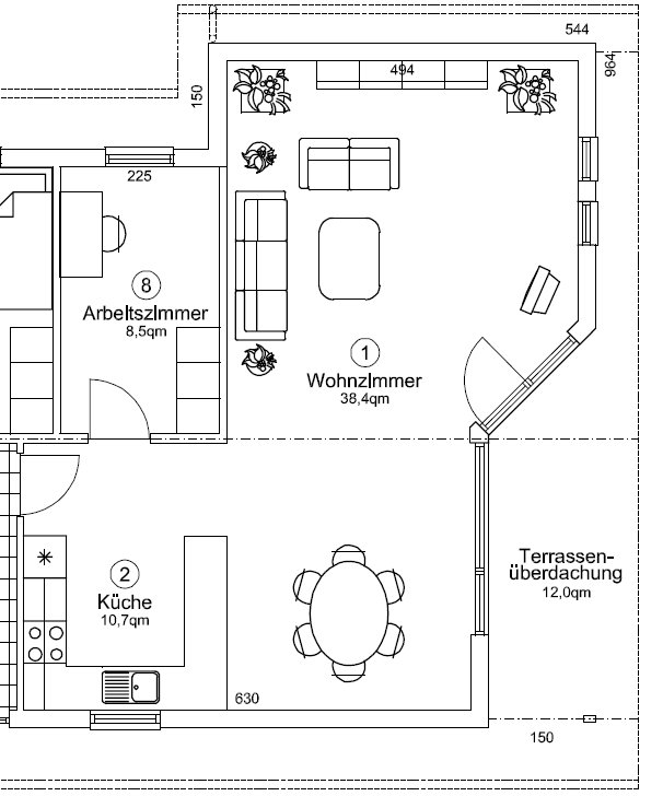 Das Wohn-/Esszimmer hat 38,4 m² mit angrenzender offener Küche von 10,7 m², und eine große Fensterfront (3-fach verglast) nach Südwesten (Glashauseffekt). s. auch Grundriss. Des Weiteren ist die Decke (zumindest im Wohn/Esszimmer/Küche) raumhoch, also bis zum Dachfirst.