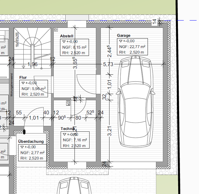 Neben diesem gedämmten Bereich soll sich, unmittelbar anschließend und über eine (T30)-Tür angeschlossen, die (vorzugsweise ungedämmte) Garage befinden. Falls relevant wird das Garagendach begehbar & begrünt sein, da der Seiteneingang (Gartenzugang) des Hauses direkt darüber liegt. Zur besseren Orientierung habe ich mal einen Planausschnitt angehängt - wobei darin noch die (meinerseits nicht gewünschte) Ausführung der Garage als gedämmter Raum dargestellt ist.