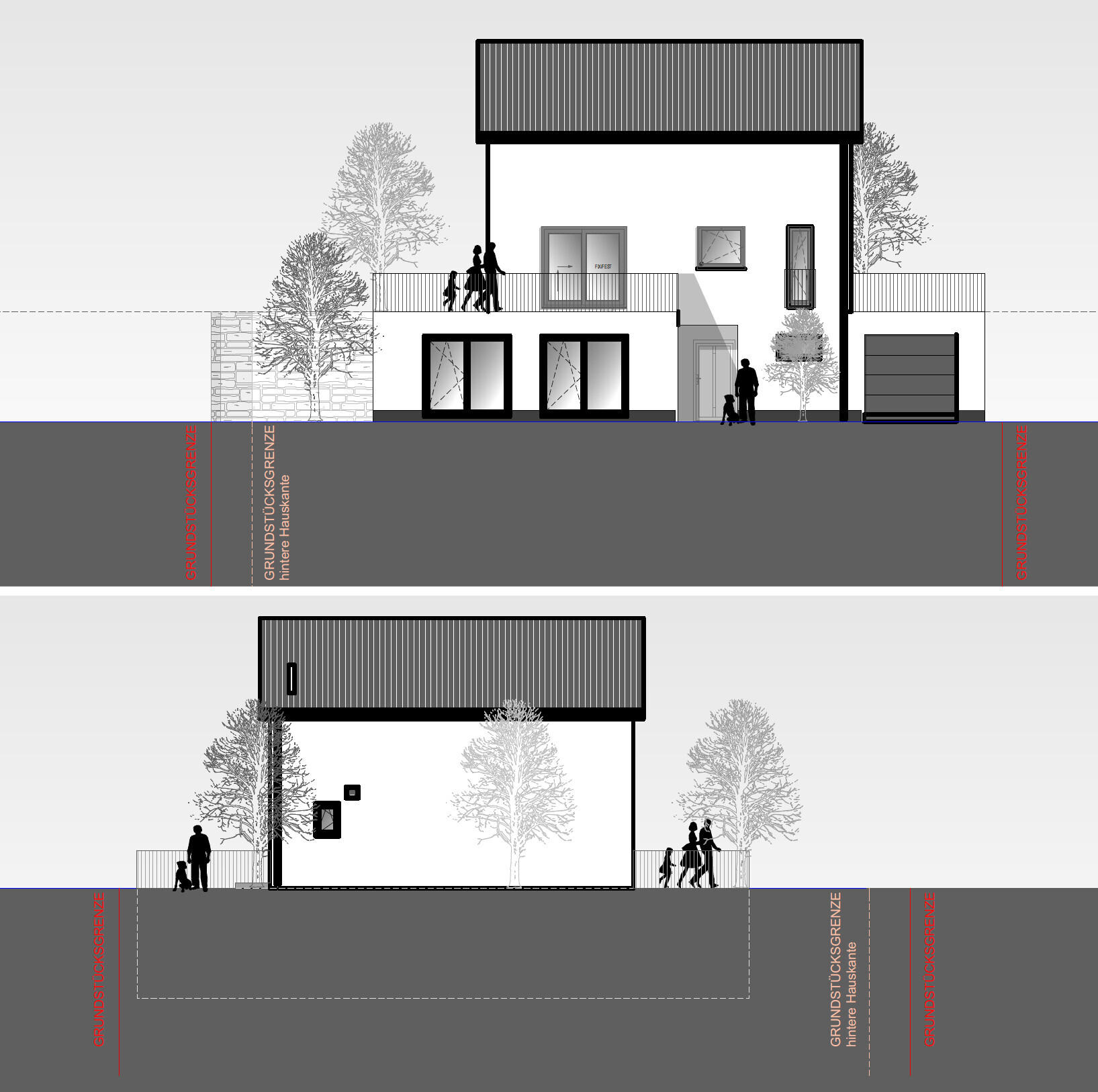 Nein, im Ernst, anbei die weiteren Pläne, voller UG/KG, EG sowie die Seitenansichten, falls es irgendwie hilfreich sein sollte.