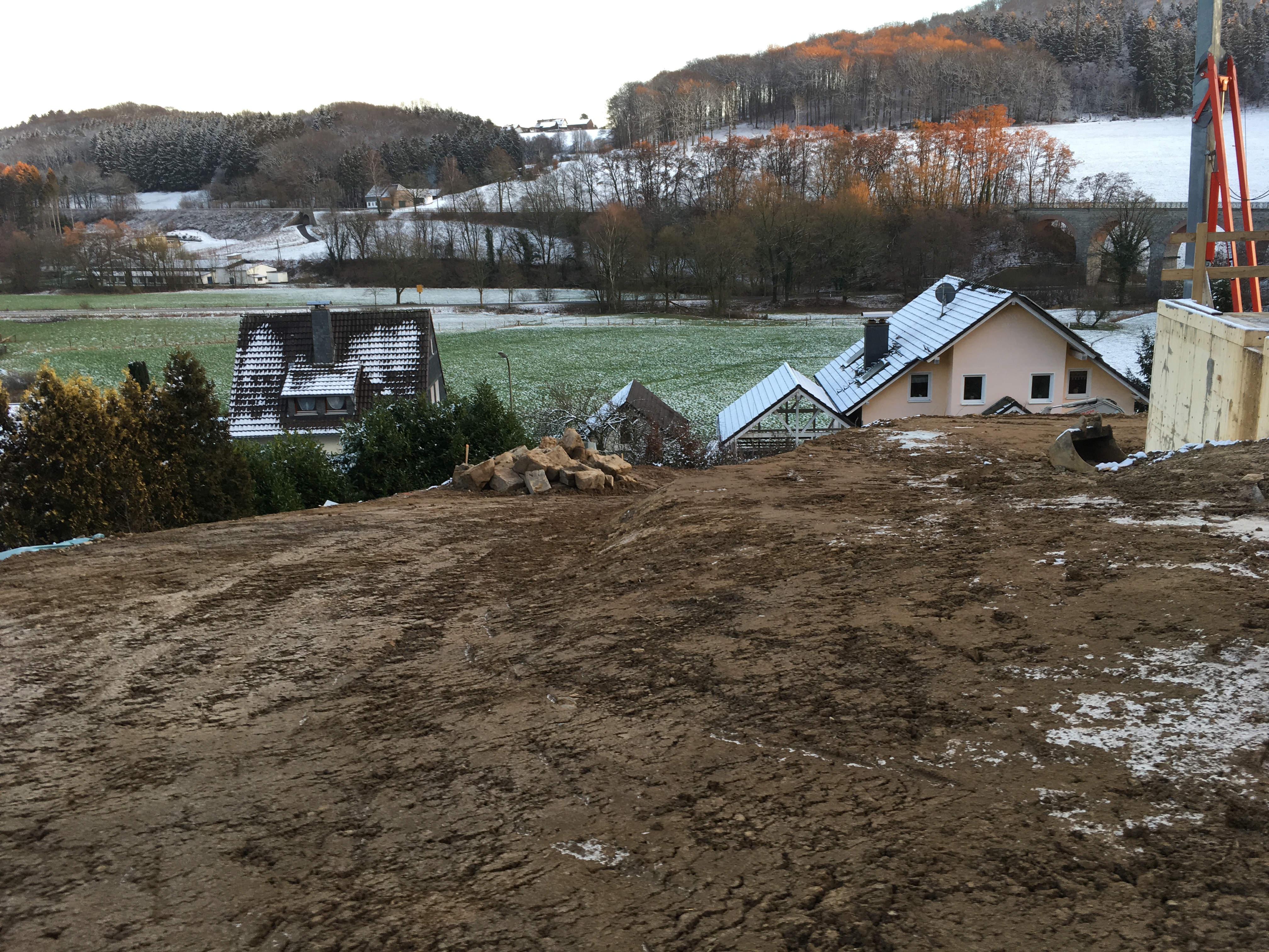 hampshire12.02.19 19:46Unser Angebot lag bei knapp 28€ je Kubikmeter. Bei locker 700 Kubikmetern eine Stange Geld. Haben dann genug Platz auf dem Grundstück gefunden, den Haufen sinnvoll zu verteilen (Bild 1). Das war am Ende billiger. Ggf. brauchen wir eine neue Genehmigung für den Carport, denn dieser sollte auf niedrigerem Niveau da stehen, wo nun eine recht steile Auffahrt ist (Bild 2).