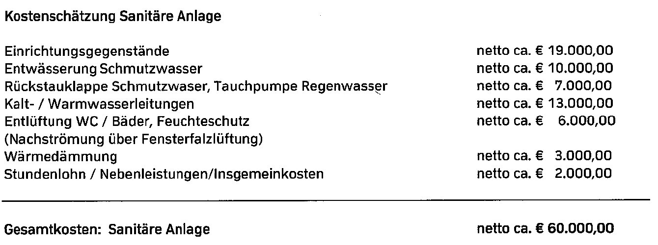 Aber der Hammer sind aus meiner Sicht die Kosten der Sanitären Anlagen. Die Objekte mal außen vor, (da kann man mit entsprechenden Ansprüchen locker auf die veranschlagten 19 TEUR kommen) ist das locker das vierfache von meinem Angebot. Und noch dazu soll die Lüftung über Fensterfalz geschehen, du hast also gar keine echte Kontrollierte-Wohnraumlüftung drin?!