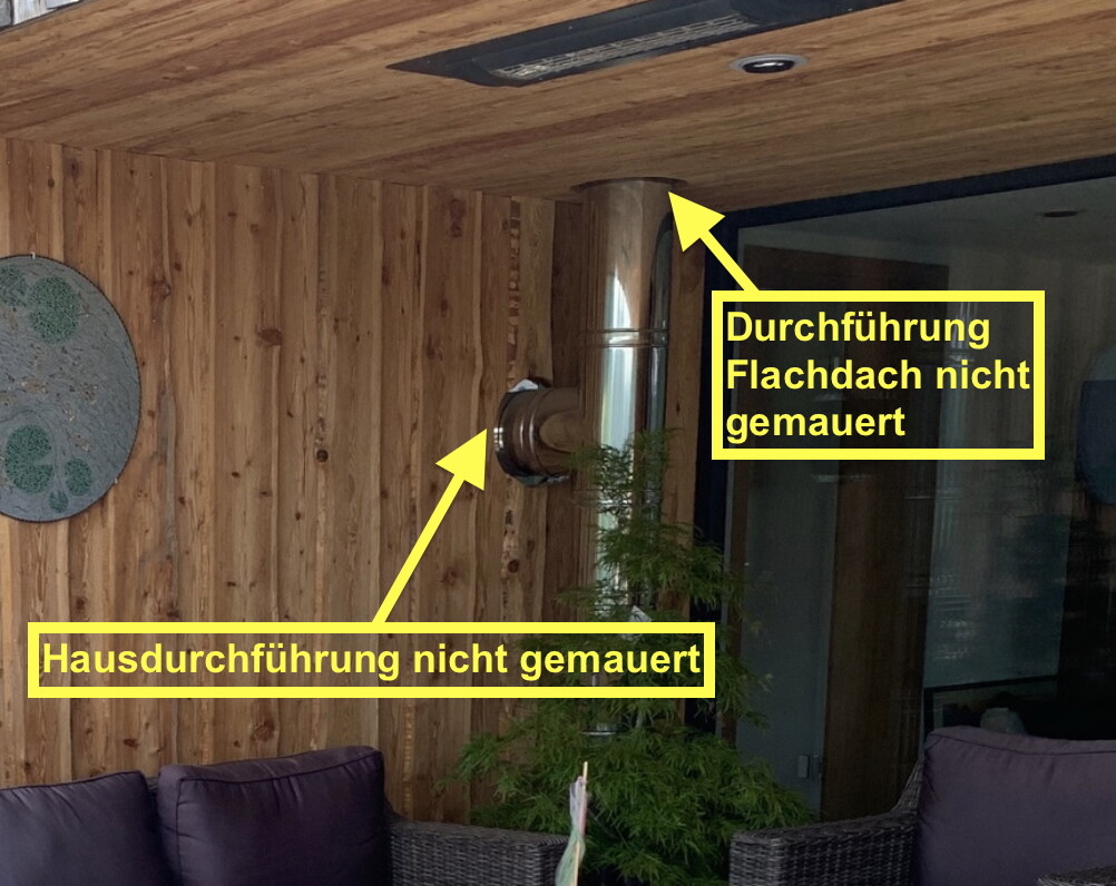 Wenn es ein Holzständerhaus ist, muss die Umgebung des Rohres ausgemauert werden, ist auch teuer.Nein das ist nicht notwendig - siehe mein zuvor gepostetes Angebot Stichwort Coolblock.Ein Bild von der Hausdurchführung nach außen packe ich bei und sehe, dass ich eine Durchführung im Angebot nicht beschrieben habe. Also: Der Kamin der Hauptwohnung hat eine Durchführung durch die Hauswand, einen durch das Flachdach über der Terrasse und eine durch das Ziegeldach. Kosten 3568€.