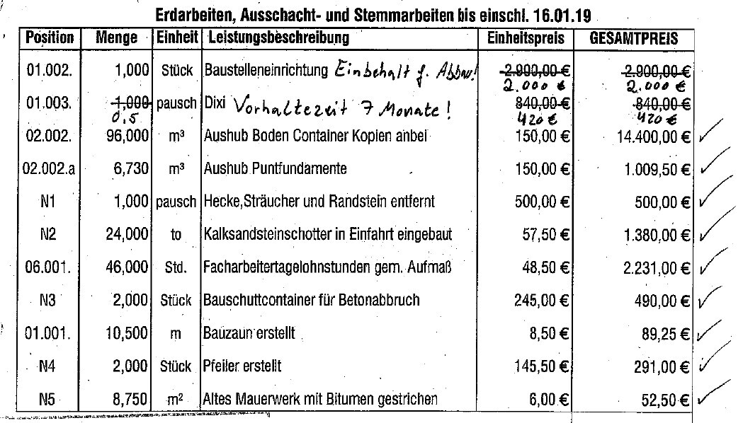 Ich bin auch jeden Tag auf der Baustelle, aber da wir absolute Laien sind, haben wir einen Architekten mit der Bauleitung beauftragt. Damit wir auf der sicheren Seite sind. *hysterisches Lachen*Alle schnappen, ins Gewissen reden Kommunikation samt Kalkulation neu aufsetzen. Und überdenken wie es weiter gehen soll.Die Positionen sind doch verrückt. Hattest Du kein Gegenangebot? Sind das Netto Preise?