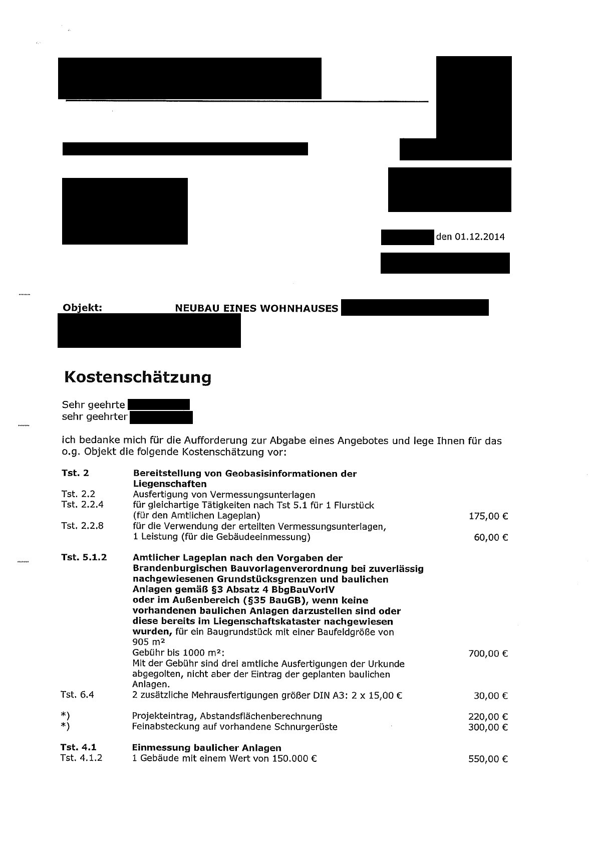 Und was habt ihr für euren Vermesser bezahlt? Sein Angebot lag dem der Planerin bei. Das Grundstück liegt im Bebauungsplan Gebiet und ist doch bereits vermessen. Wofür will er also 2.500 Euro haben? Für das Abstecken des Gebäude und Erstellung des Lageplanes?