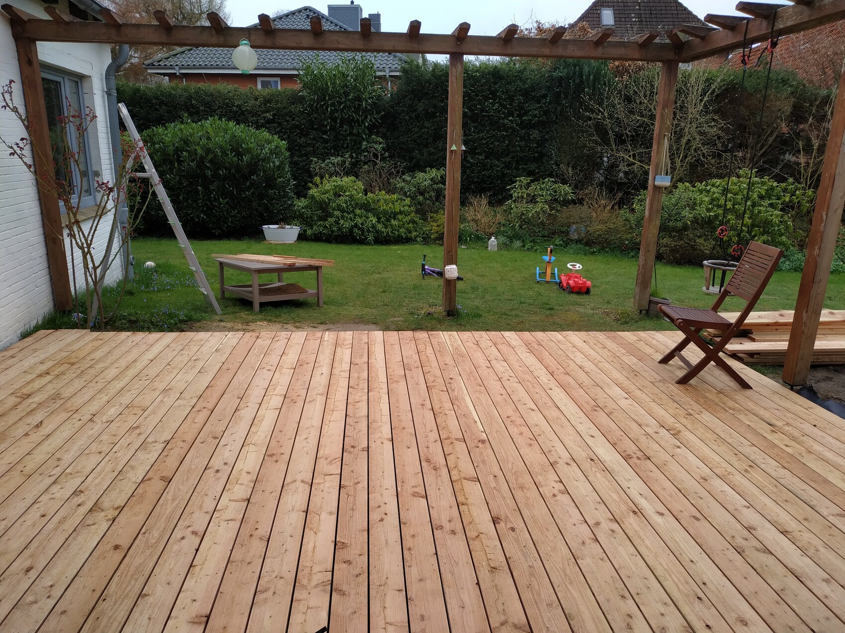Hier die Terrasse. Bild aus Februar, da war sie noch nicht fertig. Rechts sieht man den Holzstapel. Wurde nach Rechts noch auf 2m Dielendlänge, statt wie hier 4m, für ca. 6,5m weitergeführt. (Die Pergola hat noch der Vorbesitzer errichtet).