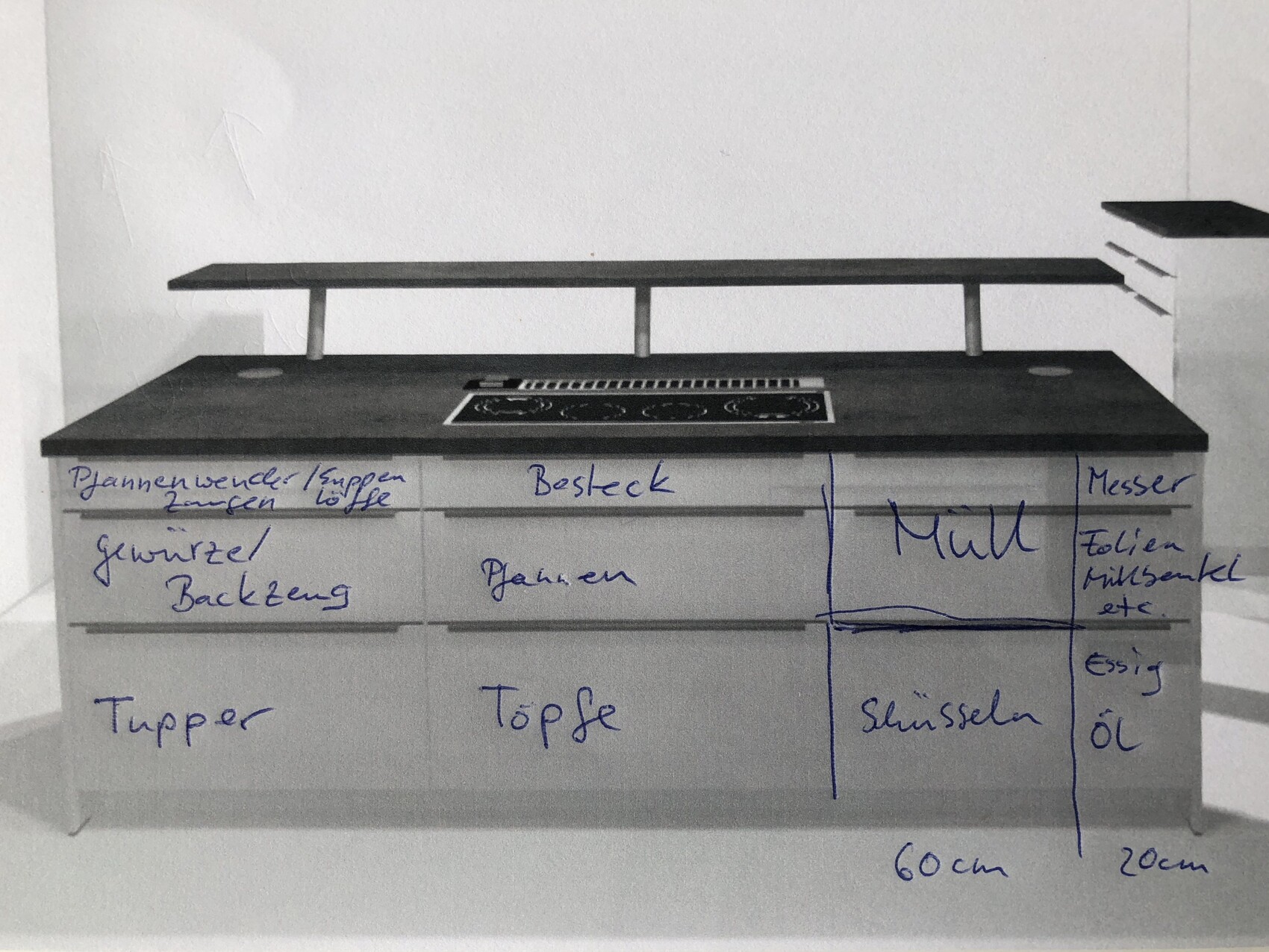 Meine Anmerkung: Teller in 2er tiefen Auszügen, sonst kriegt man die Stapel aus Suppen- über Frühstückstellern etc. ( sofern ihr kein 18er Service verstaut ).
