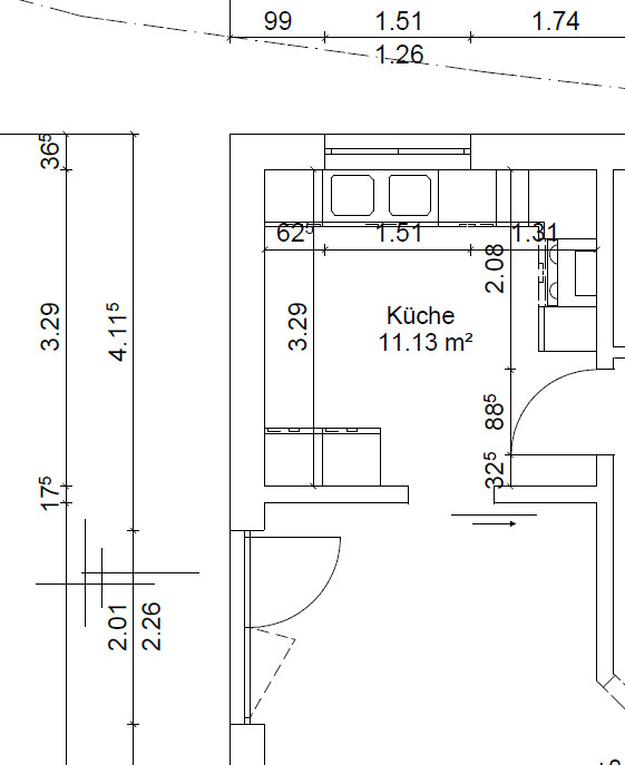 ich würde niemals eine Küche mit drei Ecken planen, das ist doch Platzverschwendung. Man könnte bei euch zum Beispiel eine L-Form planen (nur die obere und die linke Küchenzeile und dann die Schiebetüre zum Wohnzimmer vergrößern, so eine kleiner Zugang zum Wohnraum sieht meiner Meinung nach nicht schön aus. Mit so einer Planung hättet ihr nur noch oben links eine tote Ecke.