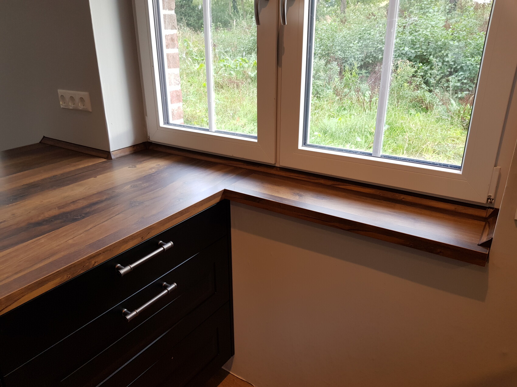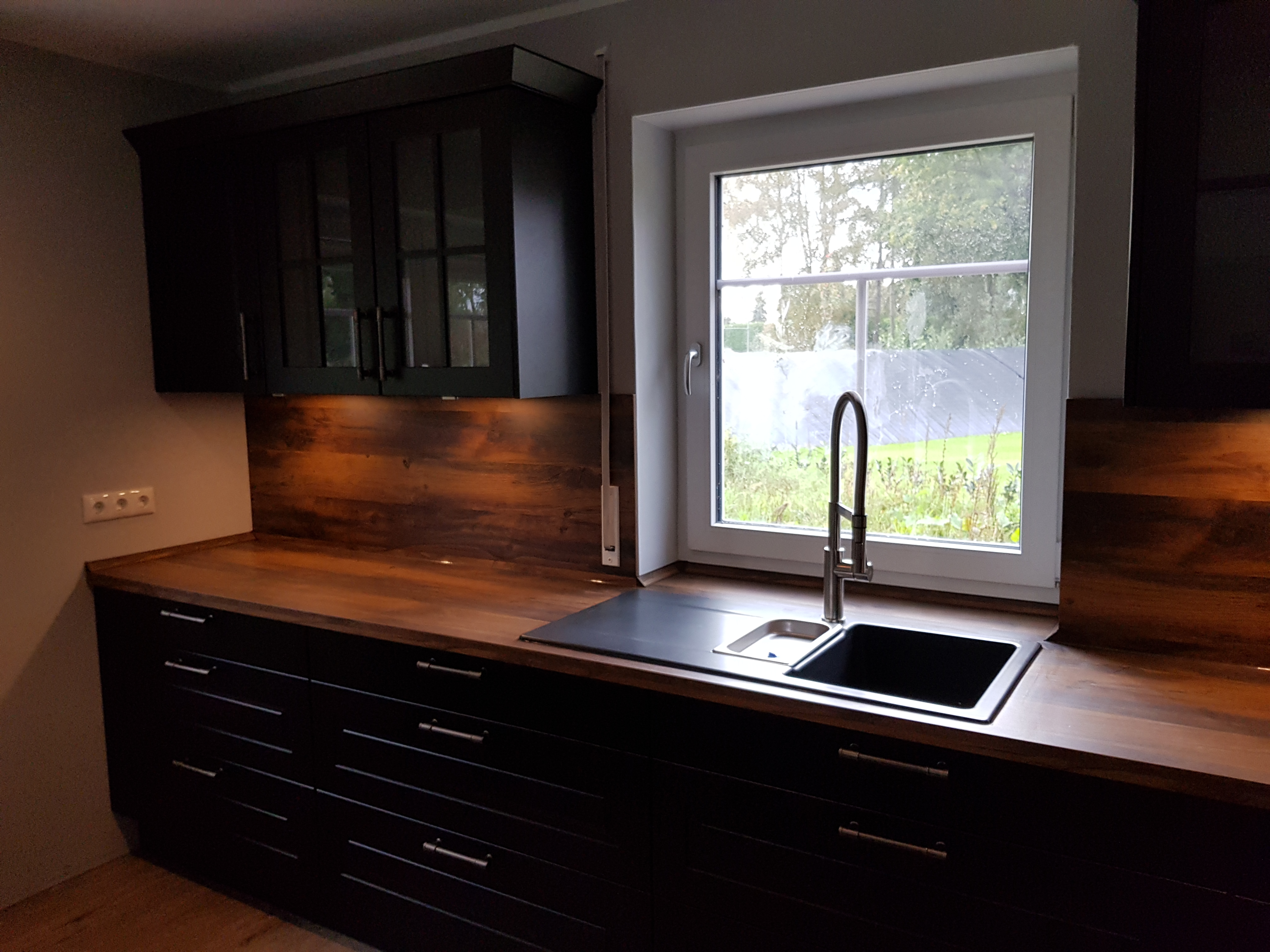 Holz-Arbeitsplatte am Fenster, darunter schwarze Küchenschränke; Blick nach außen in Garten.