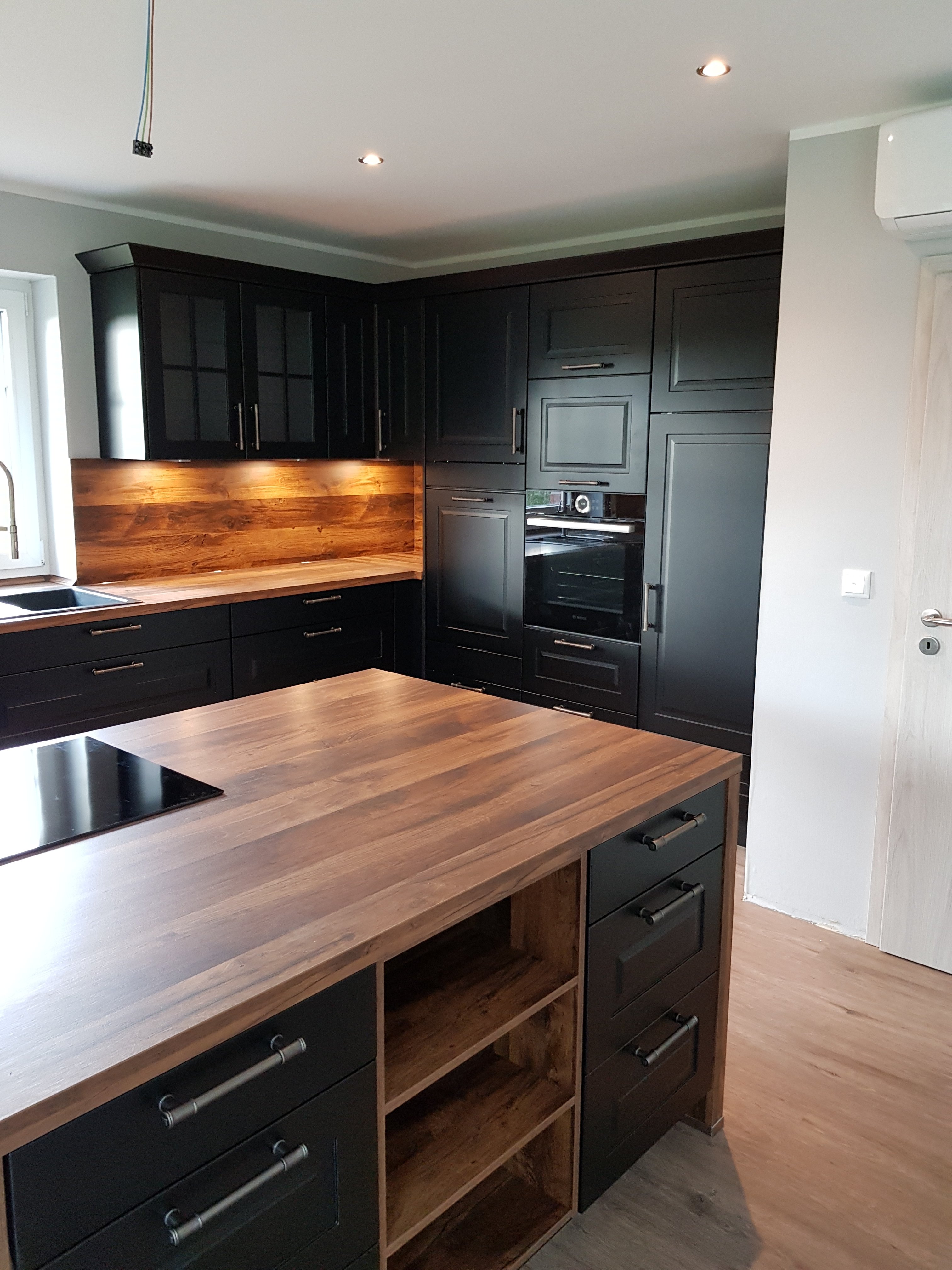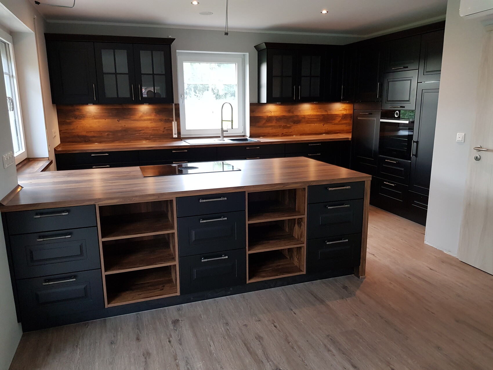 Moderne Küche mit schwarzen Fronten, Holz-Arbeitsplatten, Kücheninsel und Backofen.