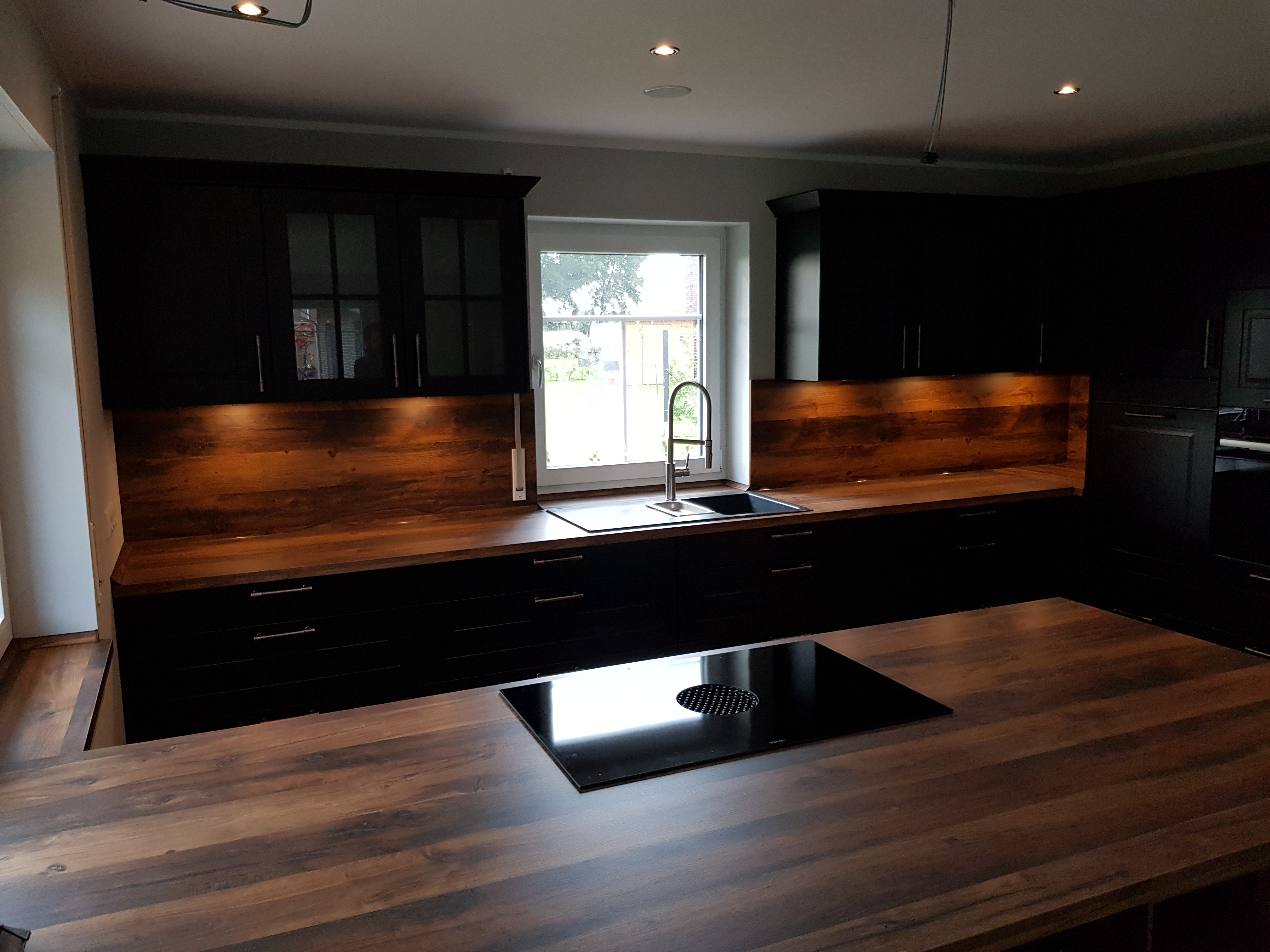 Moderne Küche mit dunklen Schränken, Holz-Arbeitsplatten, Spüle unter Fenster, Kochinsel mit Kochfeld.