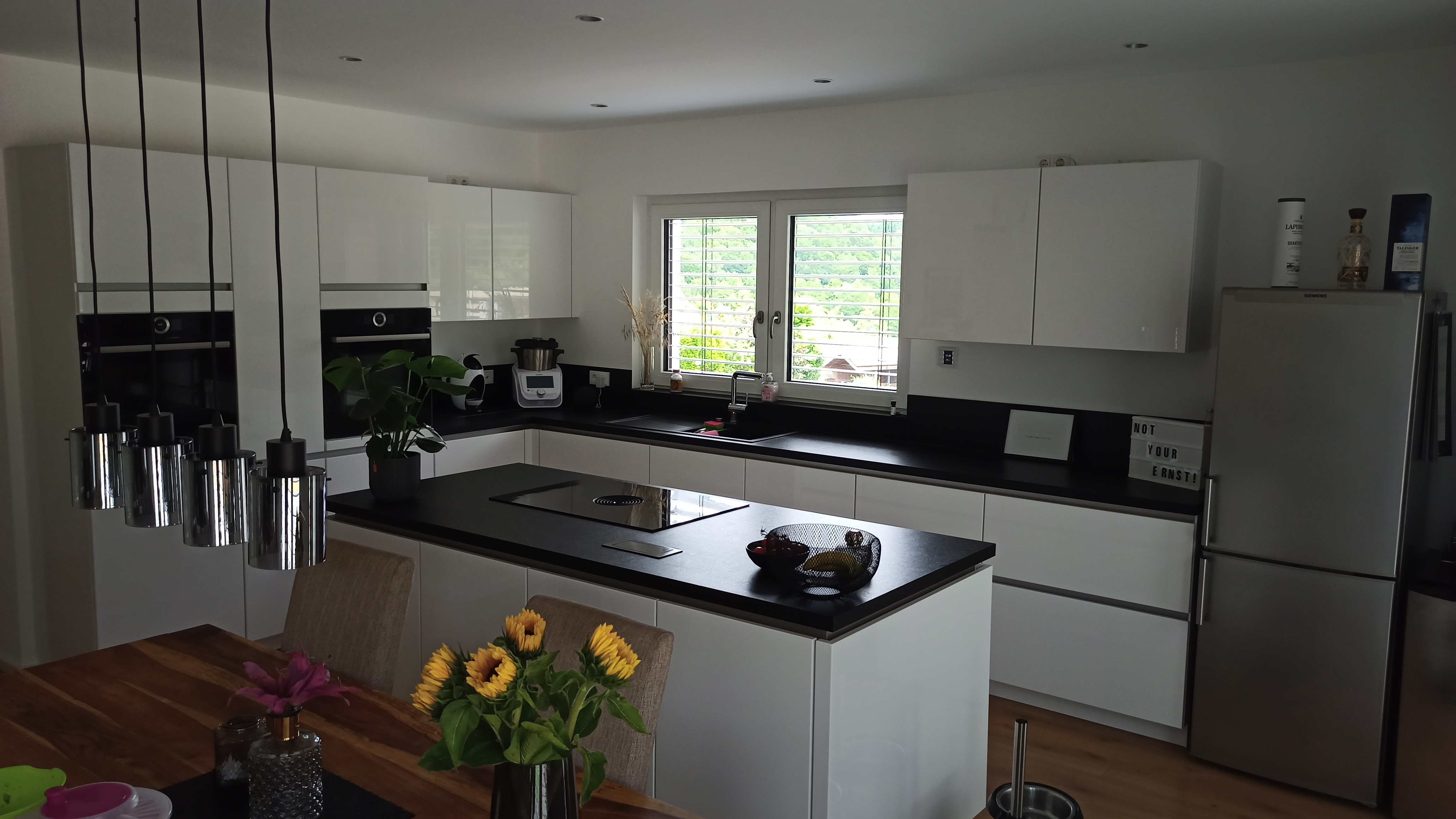 Die fehlende Raumhöhe, bzw. die gedrückte Optik, ist mit der Einrichtung besser geworden. Lebt sich bisher sehr angenehm. Jetzt muss noch das Atrium endlich fertig werden (schon zwei Wochen hinter Plan) und dann gehts an den Garten.Auch wenn schwarze Küchen eigentlich nicht mein Fall sind, sieht das sehr modern und stimmig aus. Es passt, weil alles andere weiß ist und mit dem Holz interessante Akzente gesetzt werden.H
