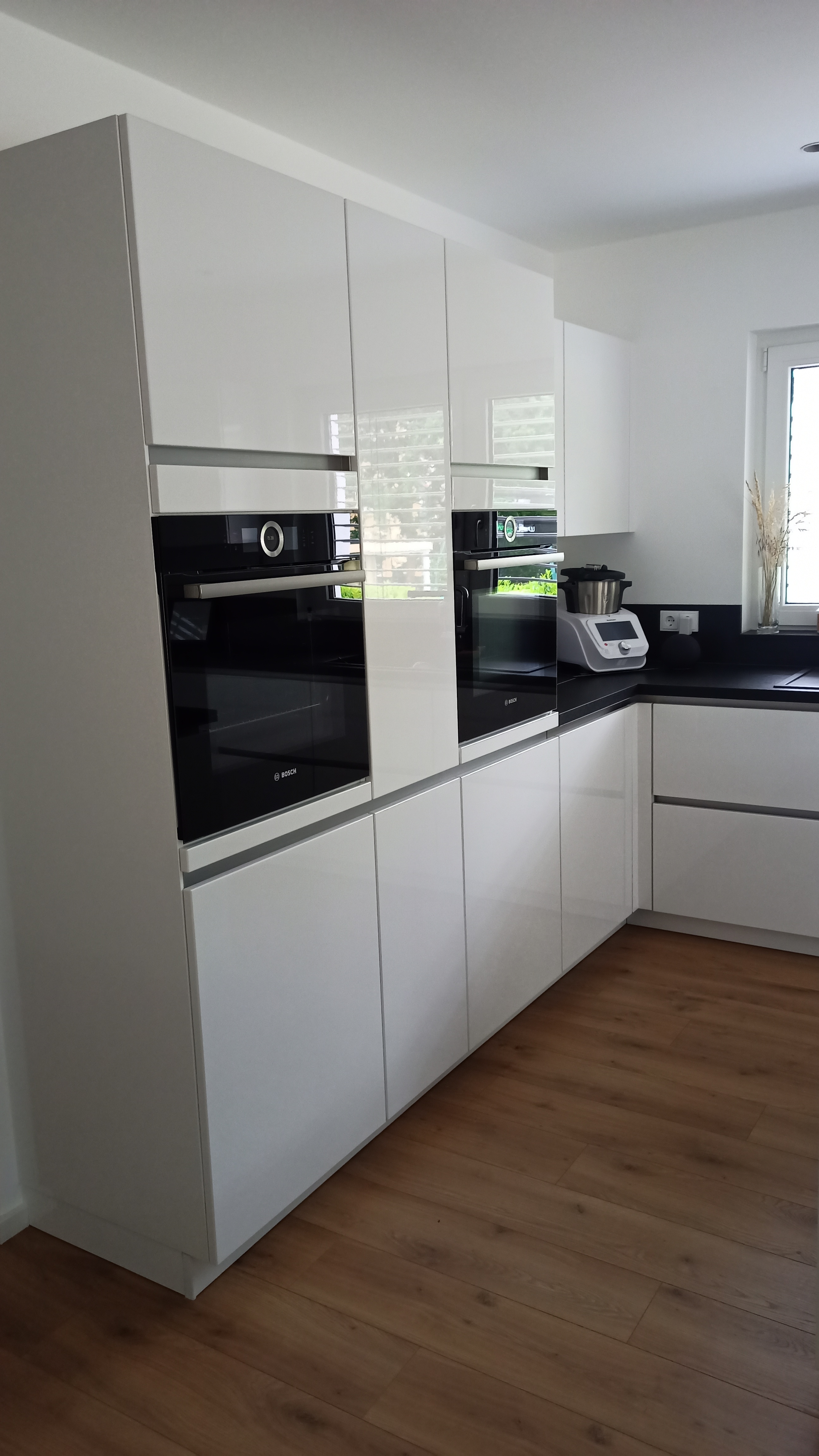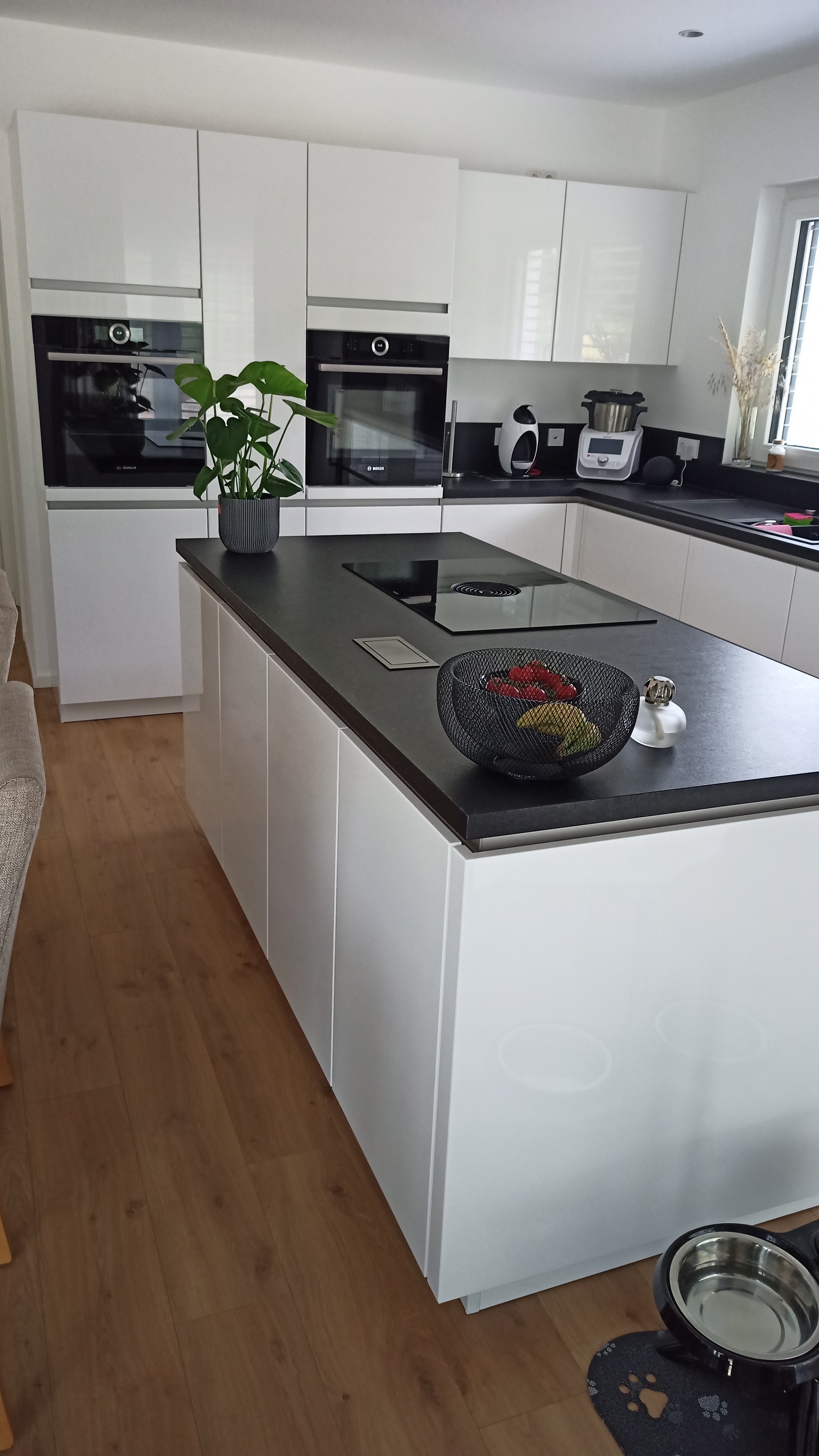 Nur die Brot-und Aufschnittschneidemaschine steht fest auf der Arbeitsplatte. Nicht so schön, aber wegen den Krümeln wollte ich sie nicht irgendwo im Schrank haben. Für das Problem suchen wir auch noch eine Lösung ... gefühlt braucht man um eine Brotschneidemaschine einen eigenen Glaskasten als Krümelbegrenzung - oder jeden Tag den Staubsauger -.-
