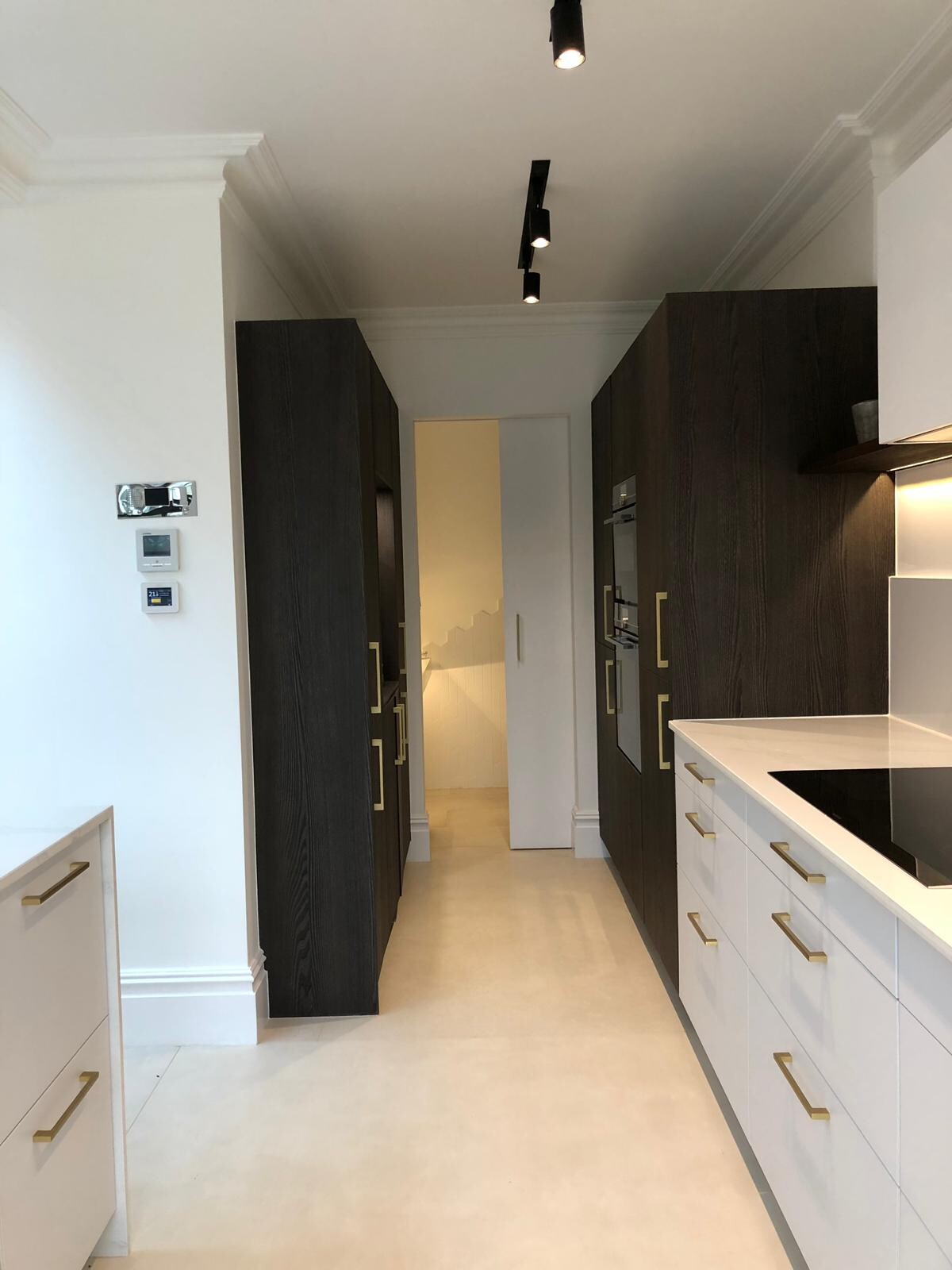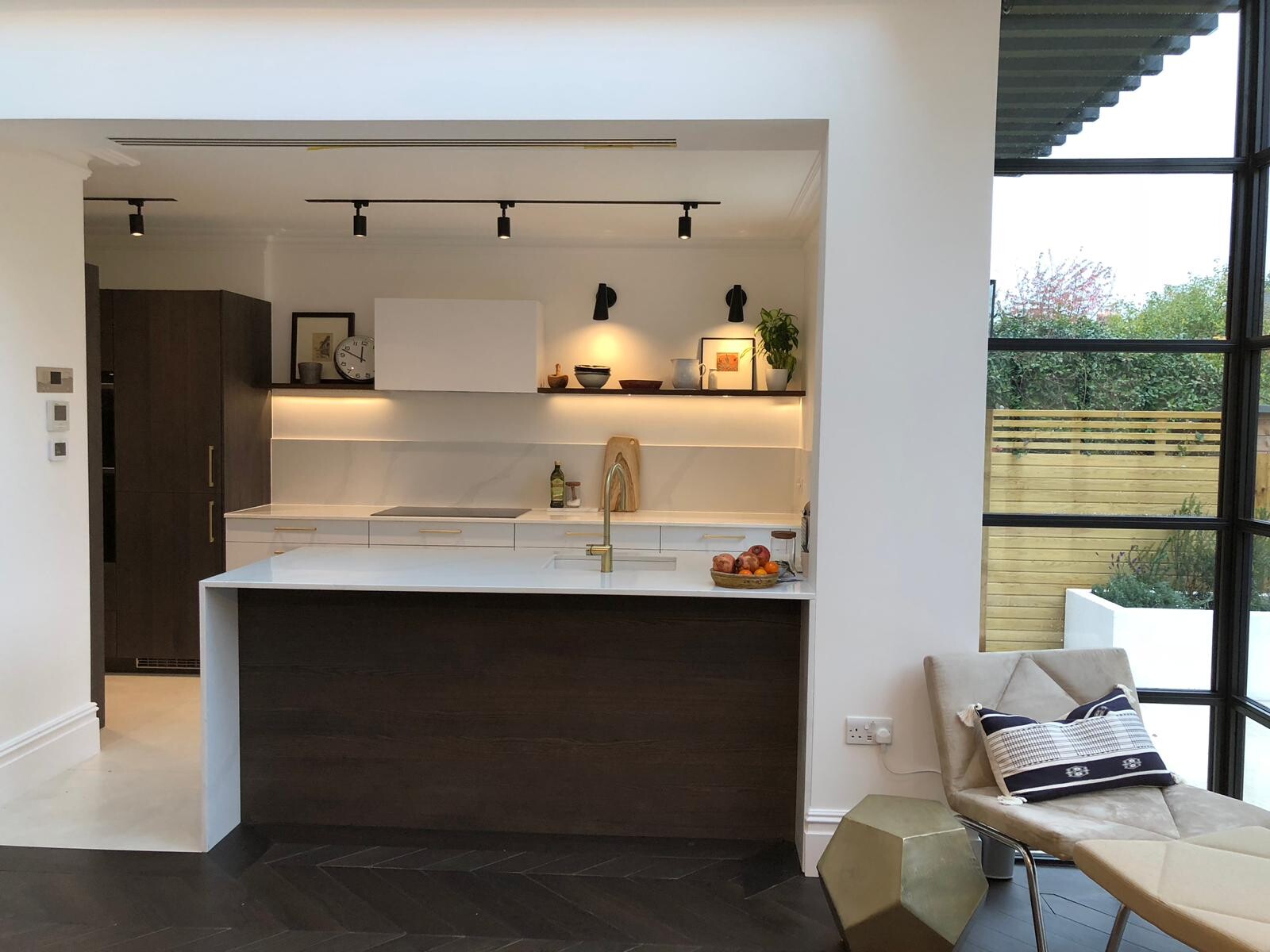 Sieht edel und durchdacht aus. Etwas Wärme bringt der angesetzte Tisch / Arbeitsplattenverlängerung mit der klaren Form. Mich irritieren die oberschrankfreien und schlicht gehaltenen Wände - als würde dort etwas fehlen.Die Wärme kommt noch vom offenen Wohn- und Essbereich im Anschluss. Hier ist wieder viel mit Holz Oberschränke: wo passen noch welche hin? Und was lagert ihr darin so alles?!