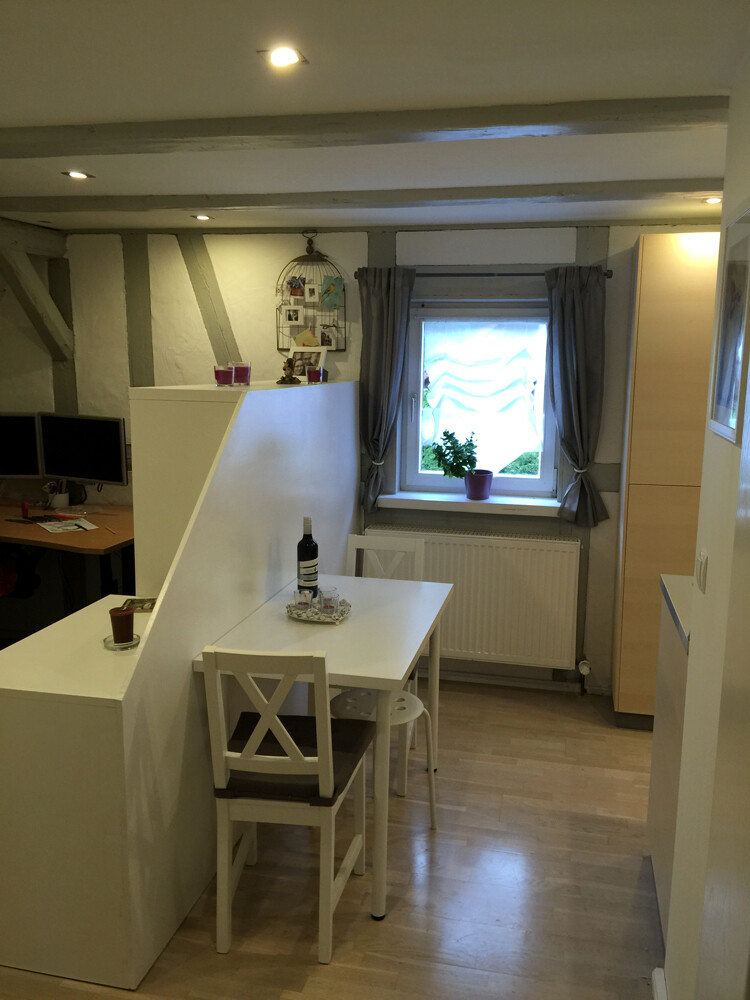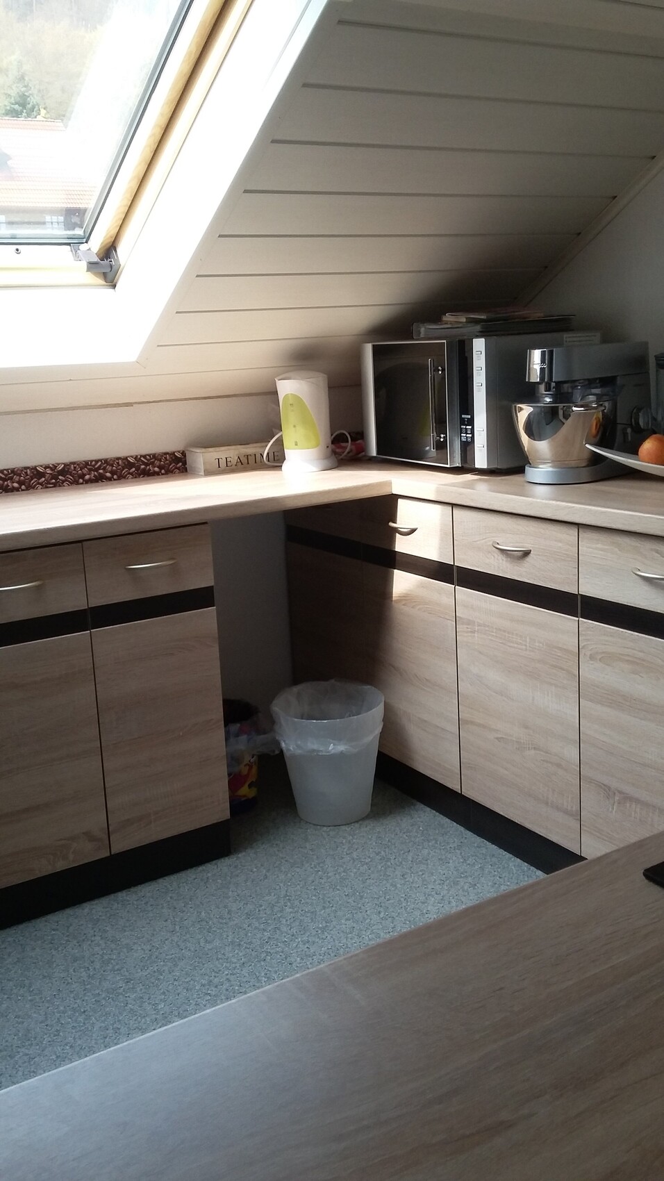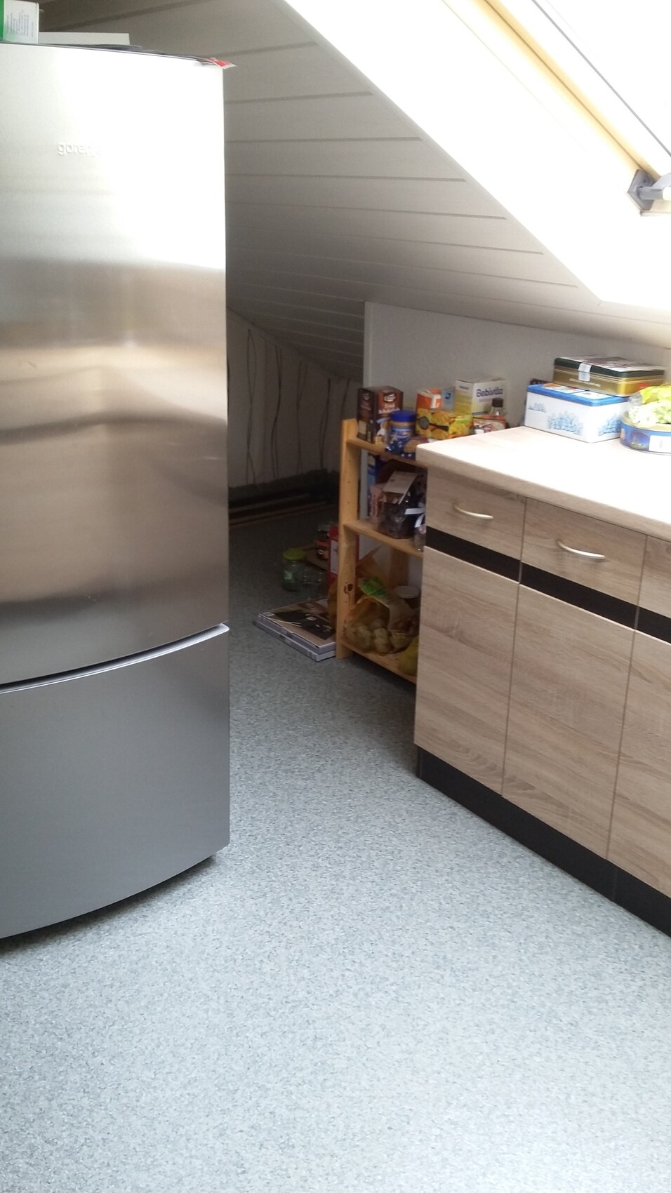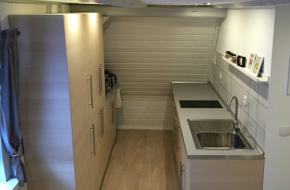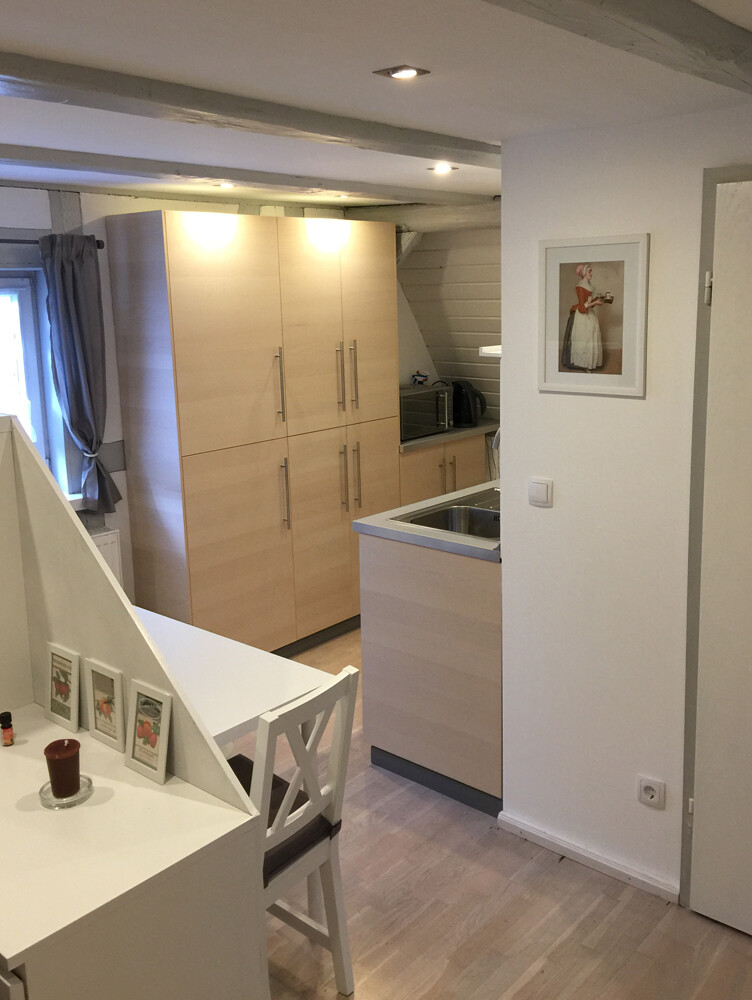 In dem Bereich zwischen Kühlschrank und Arbeitsplatte gegenüber ist noch ein Balken unter der Decke, sodass ich mit meinen 1,63m da grade so drunter passe..