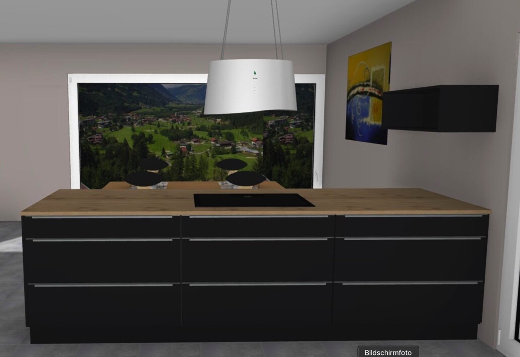 aber viel zu dunkel.Der Raum hat sehr viel Licht und Volumen. Daher haben wir uns das getraut. Die Küche kommt unter die Empore an die Betonfundamentwand. Nach Süden gibt es zwei ca. 3,8m bodentiefe breite Glasfaltwände. Ihr seht schon alle Wände im Raum."Batman Küche" winde ich lustig!