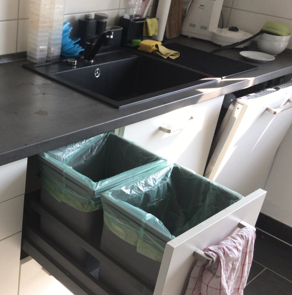Ja, Unterschrank mit Abfallsystem ist der 40er, das reicht, weil wir nur Restmüll sammeln. Kompost kommt immer gleich raus in den Komposthaufen hinterm Haus.
