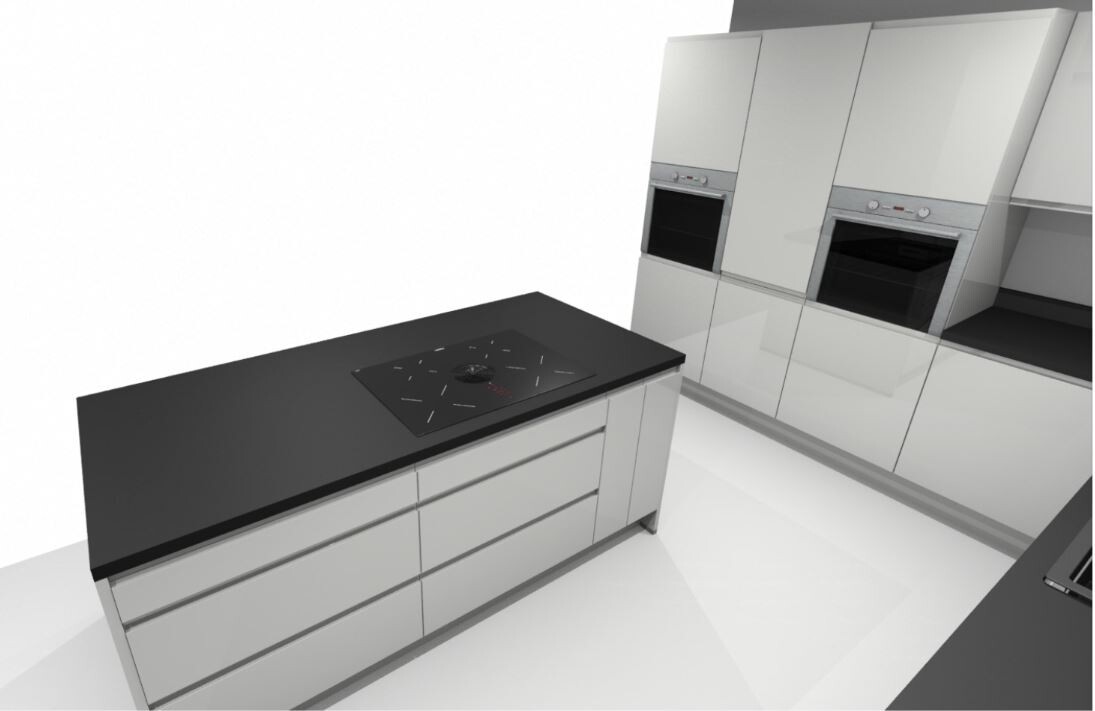 Ich habe zwar noch keine Bilder einer fertigen Küche, aber zumindest eine 3D Ansicht. Es handelt sich um eine offene Küche, die an Ess- und Wohnbereich (hinter der Kochinsel) angrenzt. Der Küchenbereich ist 3,0mx5,4m. Nach hinten sind noch ca. 6,5mx4,8 Platz für Ess- und Wohnbereich.