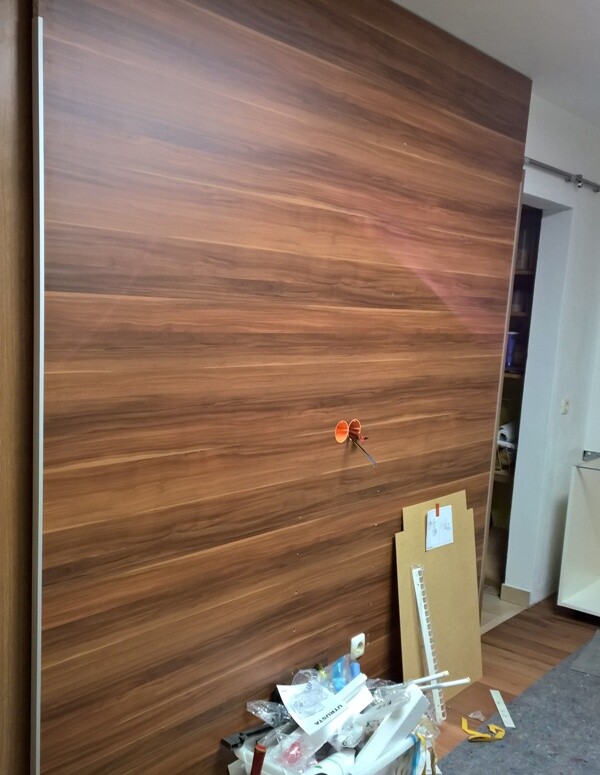 Zwischenwand vor den Schubtüren und der neue Boden ist auch etwas sichtbar.