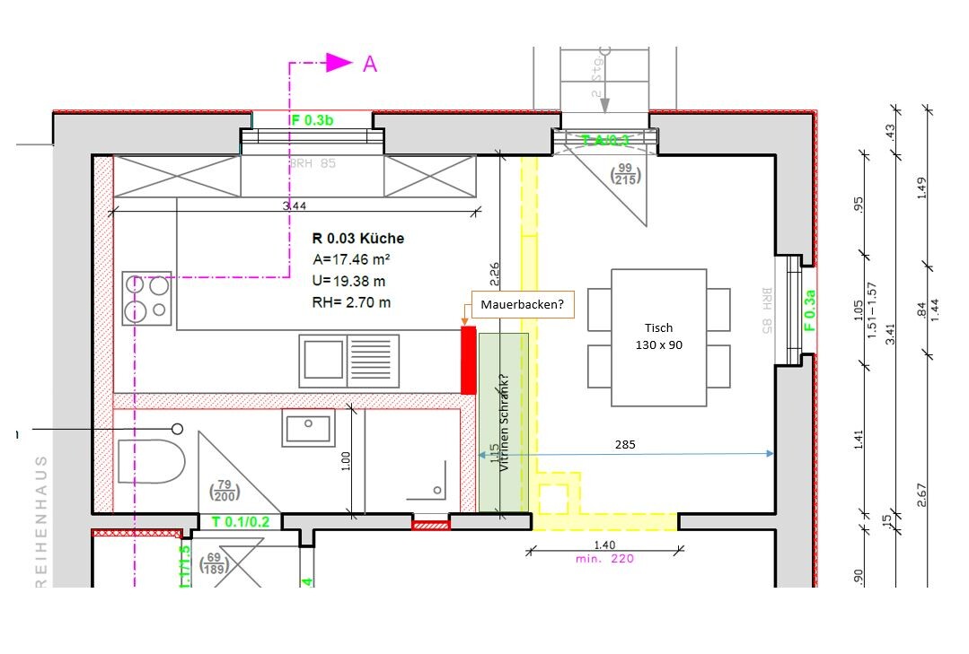 Zusätzlich stellt sich mir die Frage, ob die Wand zum Esszimmer über die Küchenschränke weitergezogen werden soll. Dies ergäbe die Möglichkeit im Esszimmer noch einen flachen schrank zu stellen. Das Esszimmer hat aber nur 2,85m Breite, wird das zu eng? (Der eingezeichnete Tisch ist m.M.n. viel zu klein).
