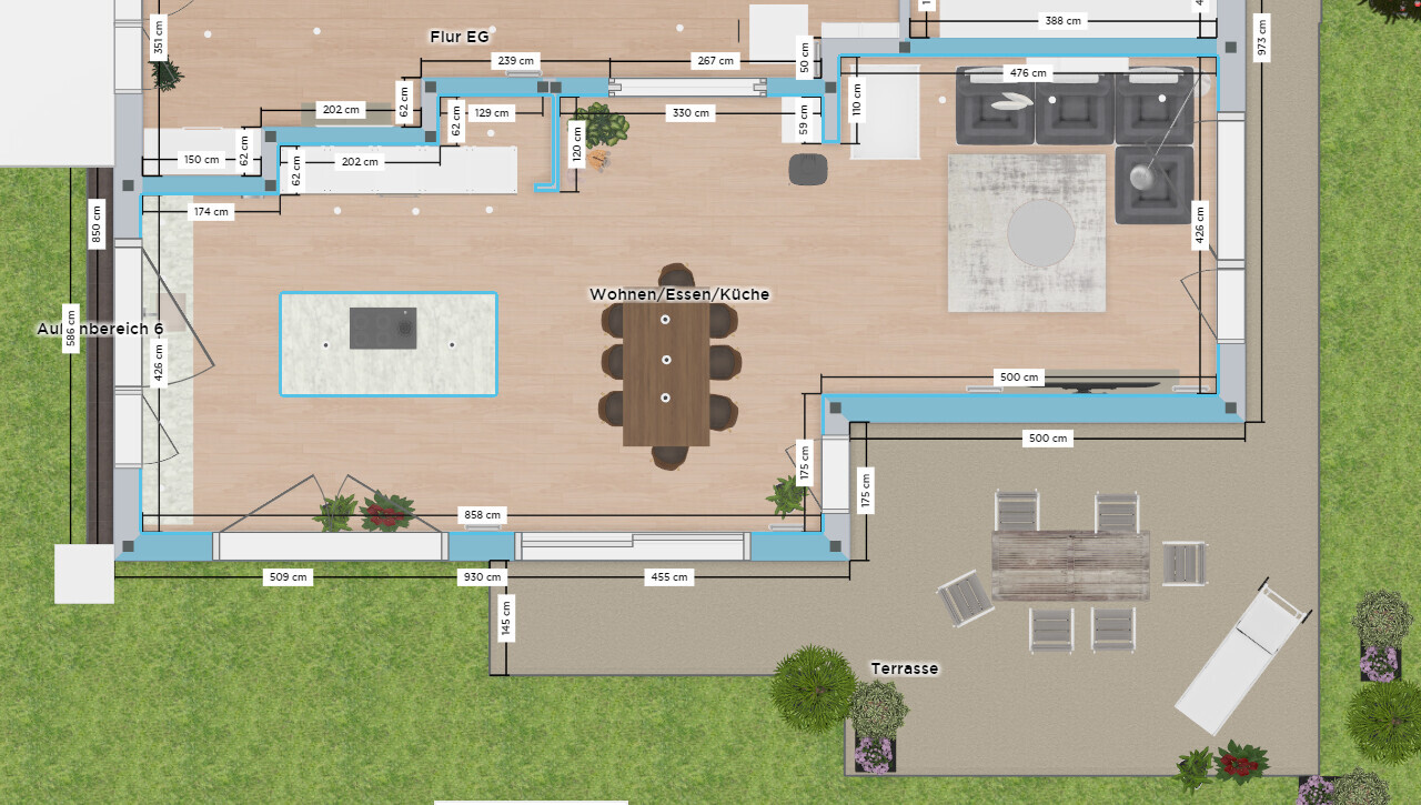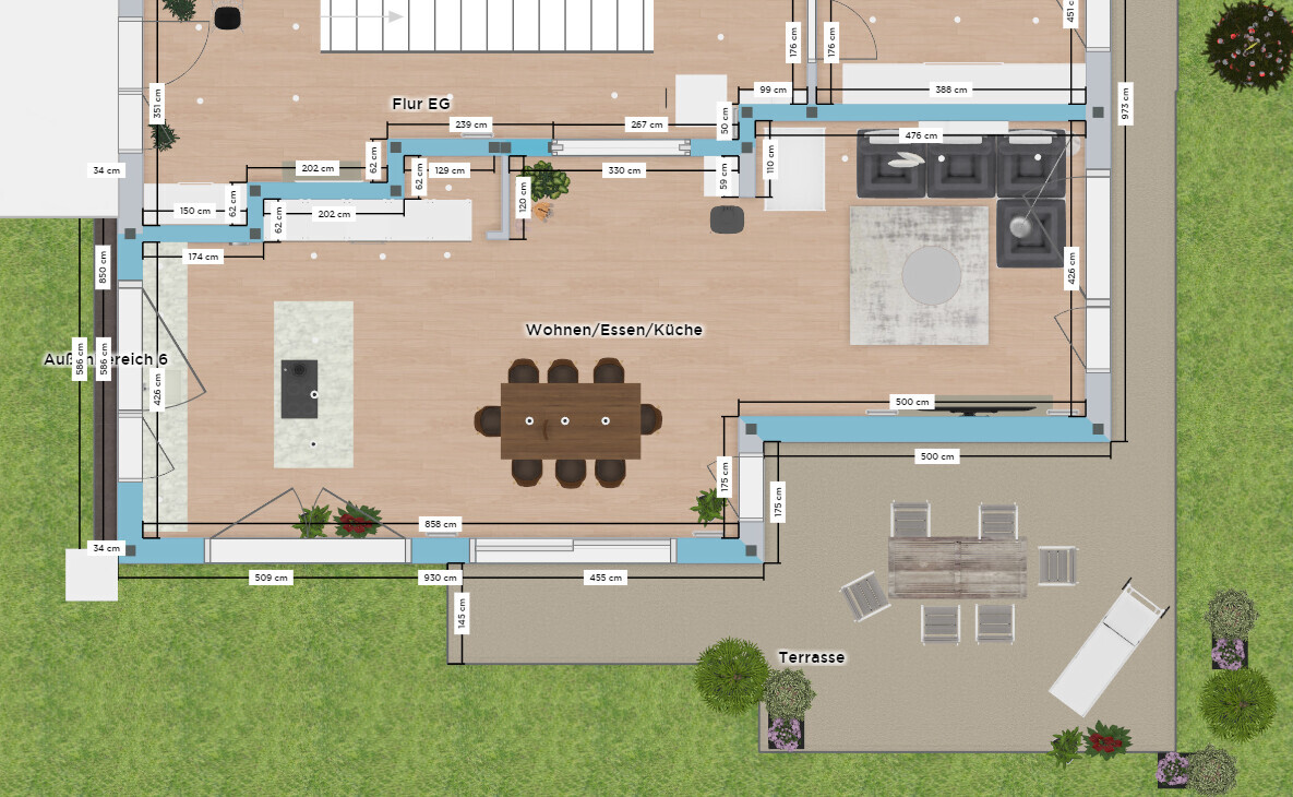 ich bräuchte eure Unterstützung bei der Küchenplanung. Speziell bei der Ausrichtung der Kücheninsel. Daraus resultiert auch die Lage des Esszimmertisches. Entschuldigt bitte die Darstellung es handelt sich um ein kostenfreies Planungstool (Home-by-me) 😉.