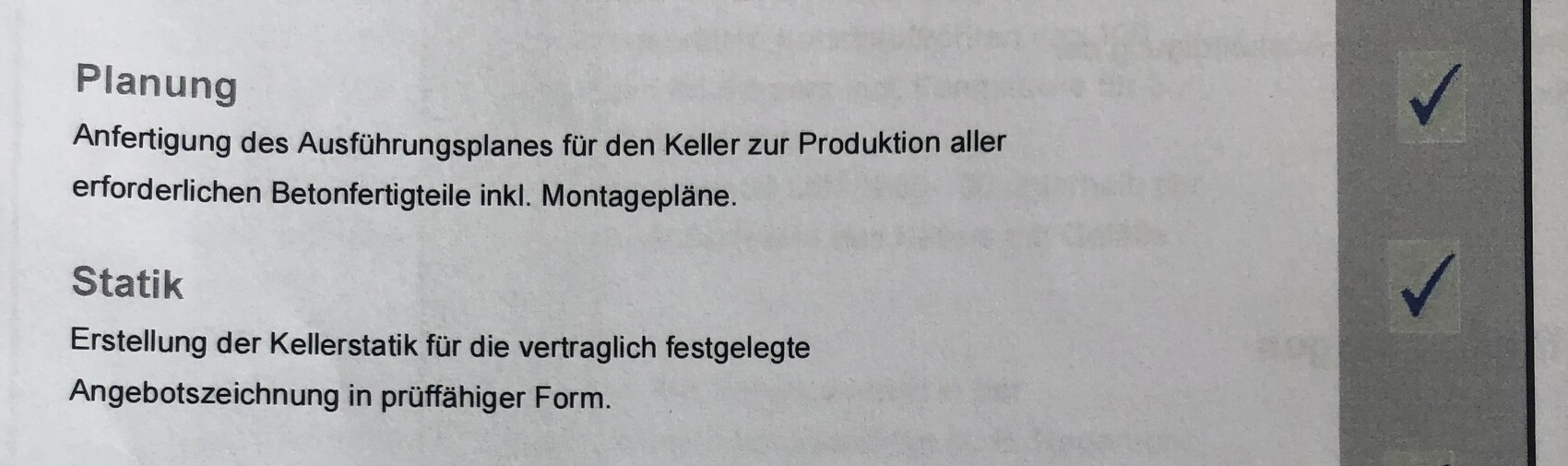Von den drei zänkischen Planungspartnern darf sich jetzt gerne wenigstens einer berufen fühlen, mir ein Dankeschön zu paypallen ;-)Das sind die Formulierungen aus denen wir NICHT entnommen haben, dass die Hausbaufirma die Werksplanung für den Keller machen soll
