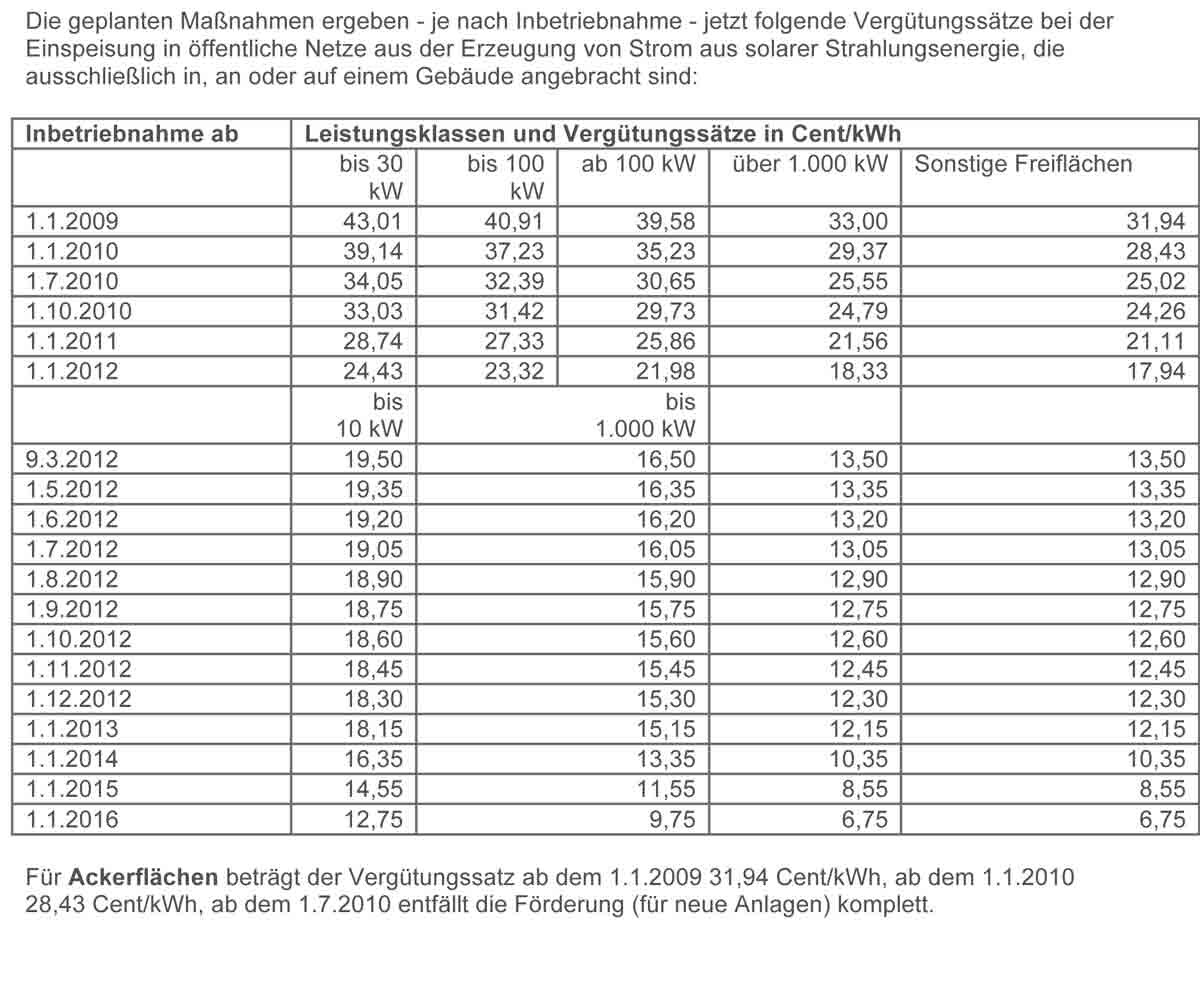 Die geplanten Maßnahmen ergeben - je nach Inbetriebnahme - jetzt folgende Vergütungssätze bei der Einspeisung in öffentliche Netze aus der Erzeugung von Strom aus solarer Strahlungsenergie, die ausschließlich in, an oder auf einem Gebäude angebracht sind: