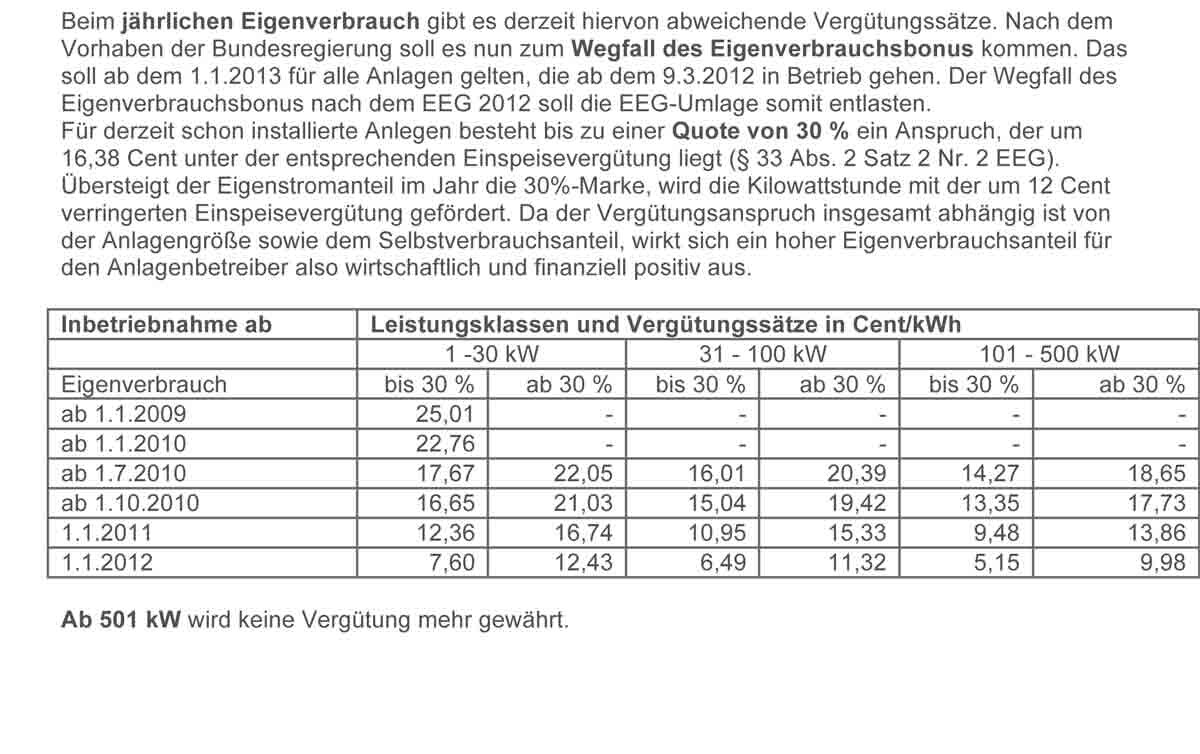 Scan eines Textdokuments über Eigenverbrauch, Wegfall des Eigenverbrauchsbonus und Vergütungstabelle