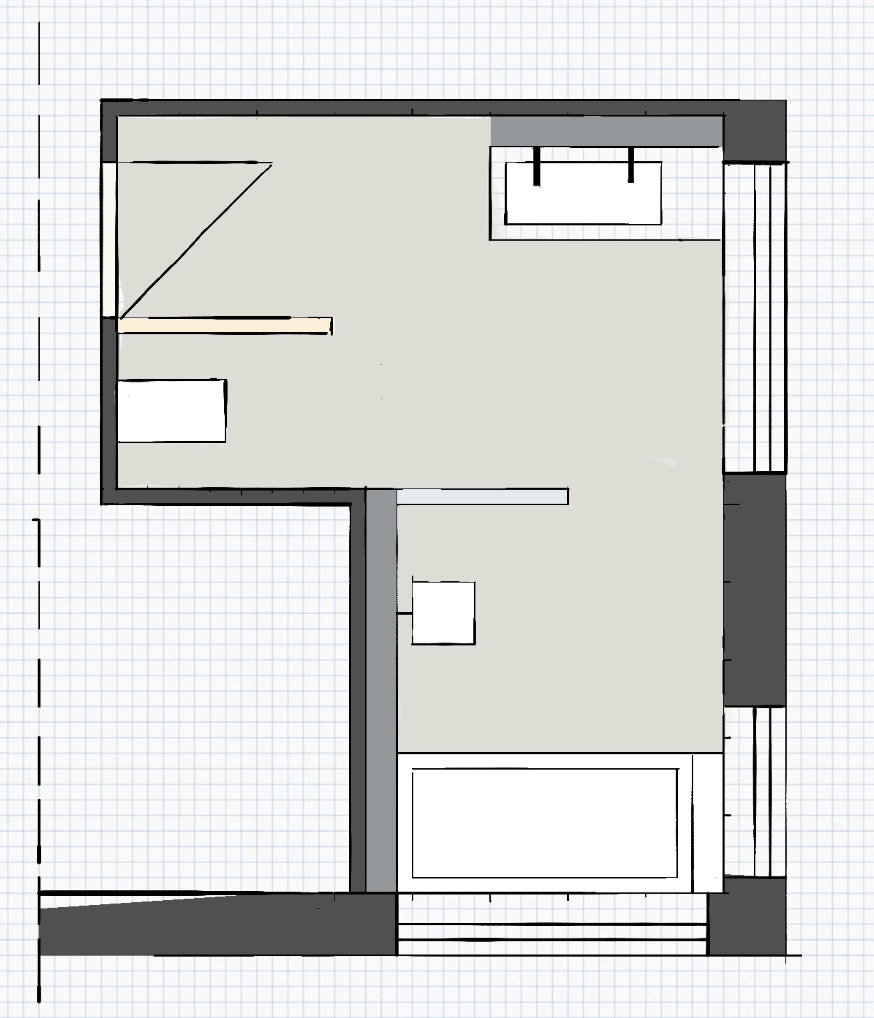 Ich finde den Ausgangsentwurf unter den Umständen sehr gut. Vermutlich würde ich bei der Dusche mehr auf Glas setzen, um den Raum optisch nicht noch zu verkleinern und zu zerhacken.